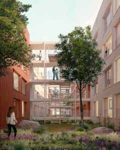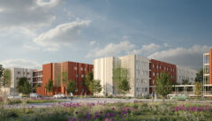 Au sud du campus, ce site diffère de ceux des autres villages d’hébergement puisqu’il est encadré d’équipements communs : le restaurant, la ferme de Trenqué et le gymnase, qui sont tous les 3 des lieux importants. C’est donc un statut très particulier de ce « nouveaux village », que traduit l’architecture proposée, avec des hauteurs limitées au R+3 et des volumes plutôt étirés qui s’apparentent à ceux des équipements voisins. Le végétal est conservé en s’insérant par un principe de lanières ; c’est ainsi que toutes les chambres, tous les espaces communs ont des vues sur un jardin. A l’image d’un village, la proposition montre de nombreuses circulations croisées, intérieures ou en passerelles, qui favorisent les rencontres et les échanges. Le vaste porche abrité, au croisement de deux circulations importantes, celle qui traverse le cœur du campus vers les bâtiments d’enseignement et celle qui relie le restaurant, la ferme et le gymnase, est un lieu majeur de rencontres. Les halls et les espaces communs du bâtiment d’hébergement sont directement desservis depuis ce porche offrant une transparence vers les deux jardins linéaires intérieurs. Les passerelles, légères et aériennes, fractionnement les bâtiments d’hébergement en petits volumes qui sont identifiés par une alternance des couleurs propres à l’ENAC : rouge terraccota et blanc craie. La couleur est laquée sur un bardage métallique aux ondes denses qui soulignent l’étirement vertical.