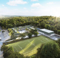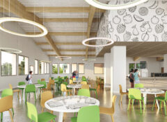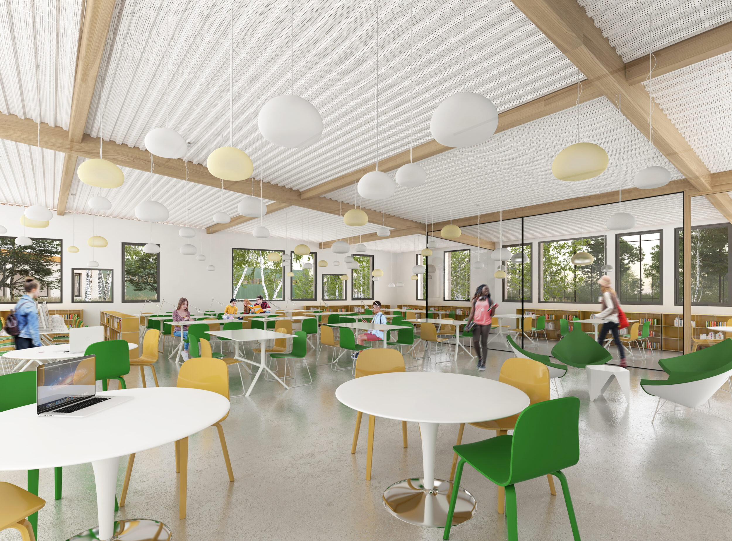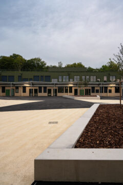 - Le collège est positionné assez loin de la voie de desserte afin de libérer la surface d’accueil du parvis. La cour se loge au cœur des bâtiments, et distribue l’ensemble des fonctions du collège. Imaginée comme une place centrale, elle offre une spatialité permettant d’installer une diversité d’occupations, en groupes, ou de façon plus intime. Cette cour permet de desservir les salles de classes d’enseignement général qui sont situées sur un R+1 chapeauté d’une toiture à deux pentes. De par la configuration du terrain et l’organisation en U du collège, ces salles de classes ont toutes une vue sur l’environnement boisé qui entoure la parcelle. Les équipements sportifs sont en léger contre bas. La salle d’activité et le gymnase sont accessibles en intérieur depuis le secteur des vestiaires. Ceux-ci sont positionnés sous le réfectoire, profitant de la déclivité du terrain.