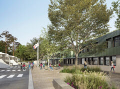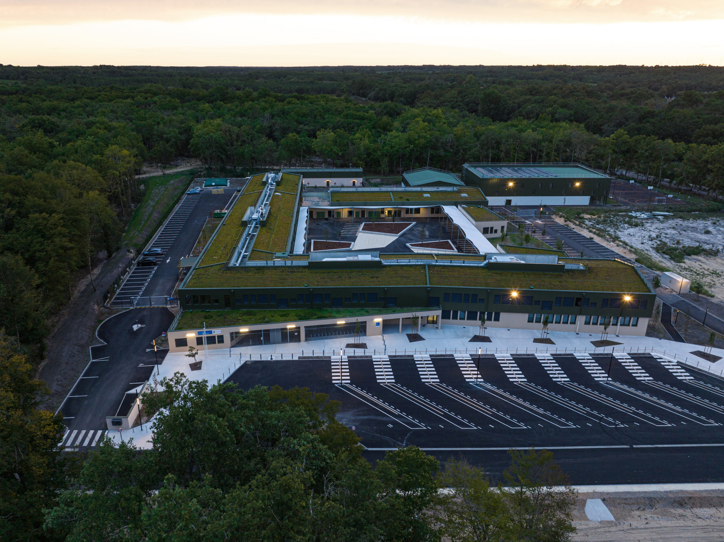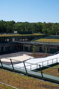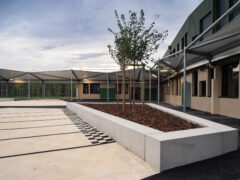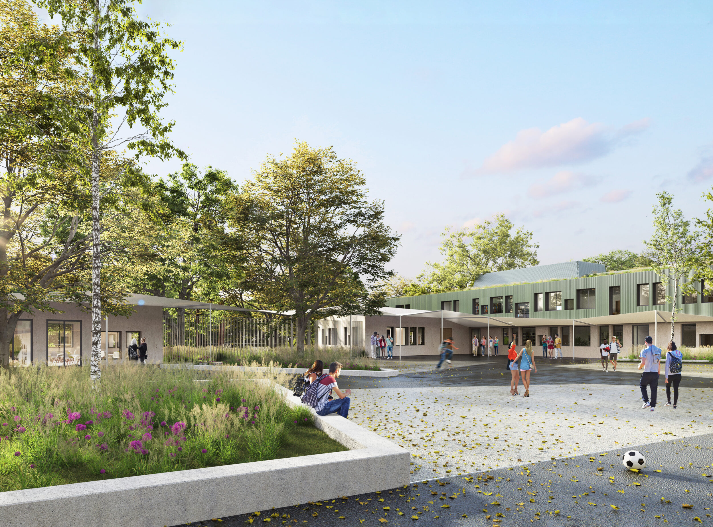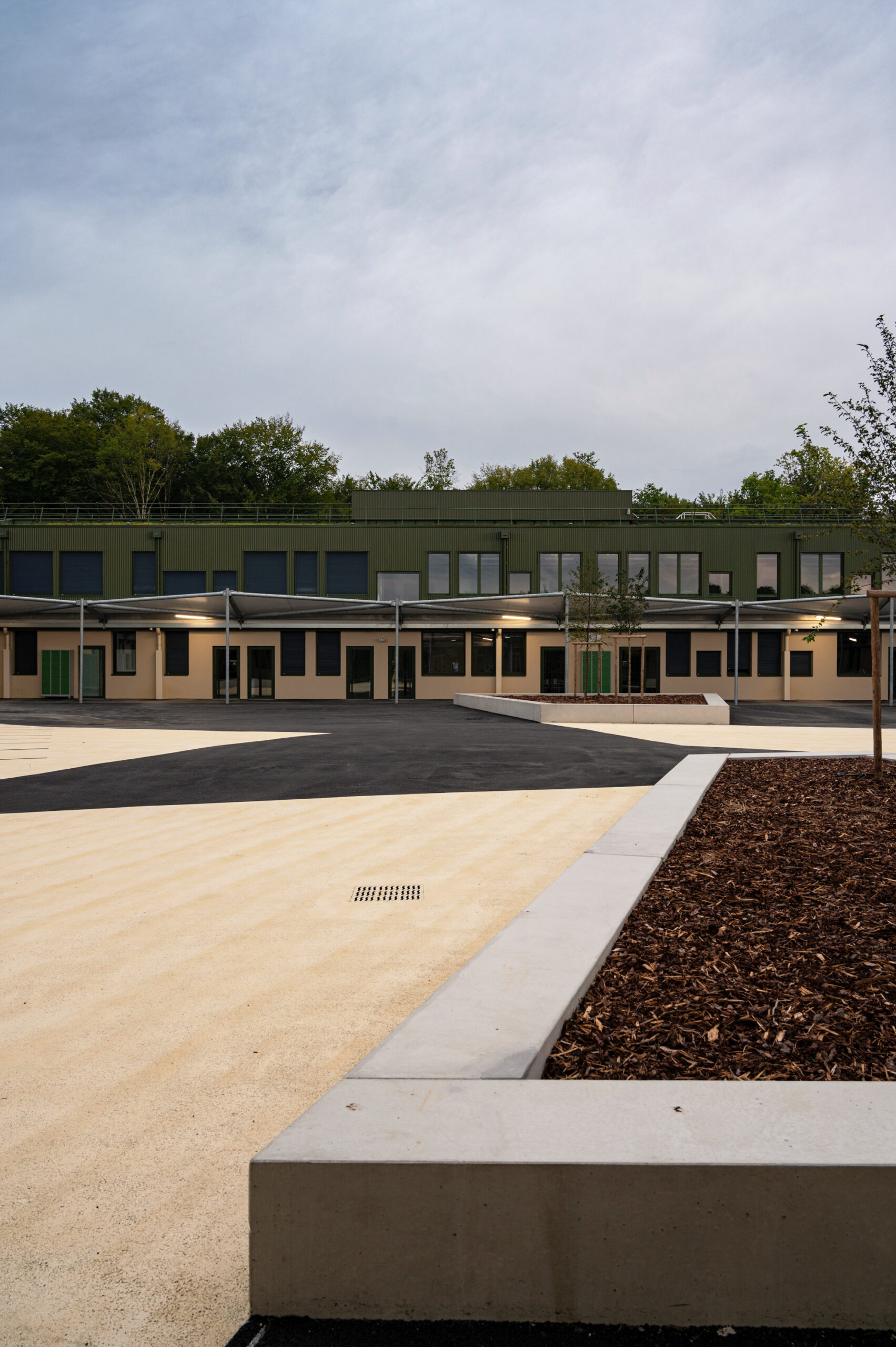 Afin de reprendre les sensations graphiques recueillies sur site, ce projet de collège se compose d’un équilibre entre deux matériaux : un socle solide, minérale en béton lasuré pour obtenir un coloris en harmonie avec l’environnement et un bardage métallique de type tôle ondulée pour l’étage plus léger. Les toitures en pentes sont habillées par un tapis végétal afin de renforcer l’intégration au site. Le collège s’articule autour de la cour de récréation. Celle-ci, profitant de la topographie, s’ouvre en belvédère sur le terrain de foot. Ce talus, planté et arboré, forme une limite naturelle entre la partie enseignement et le secteur de la pratique sportive. Les fonctions du collège sont disposées en U englobant la cour. L’entrée est située à l’angle des bâtiments sur rue, au centre des fonctions qu’elle dessert.