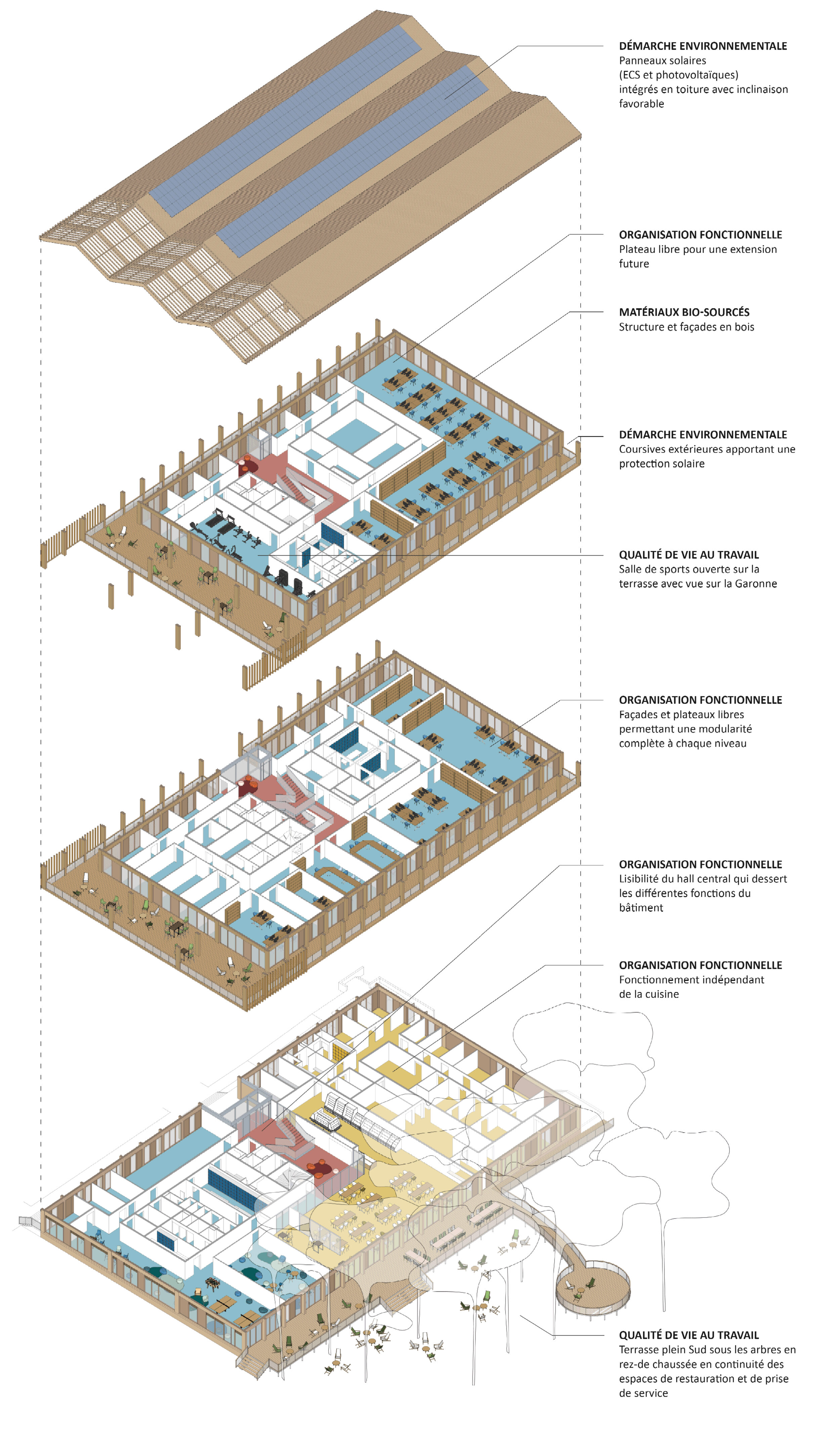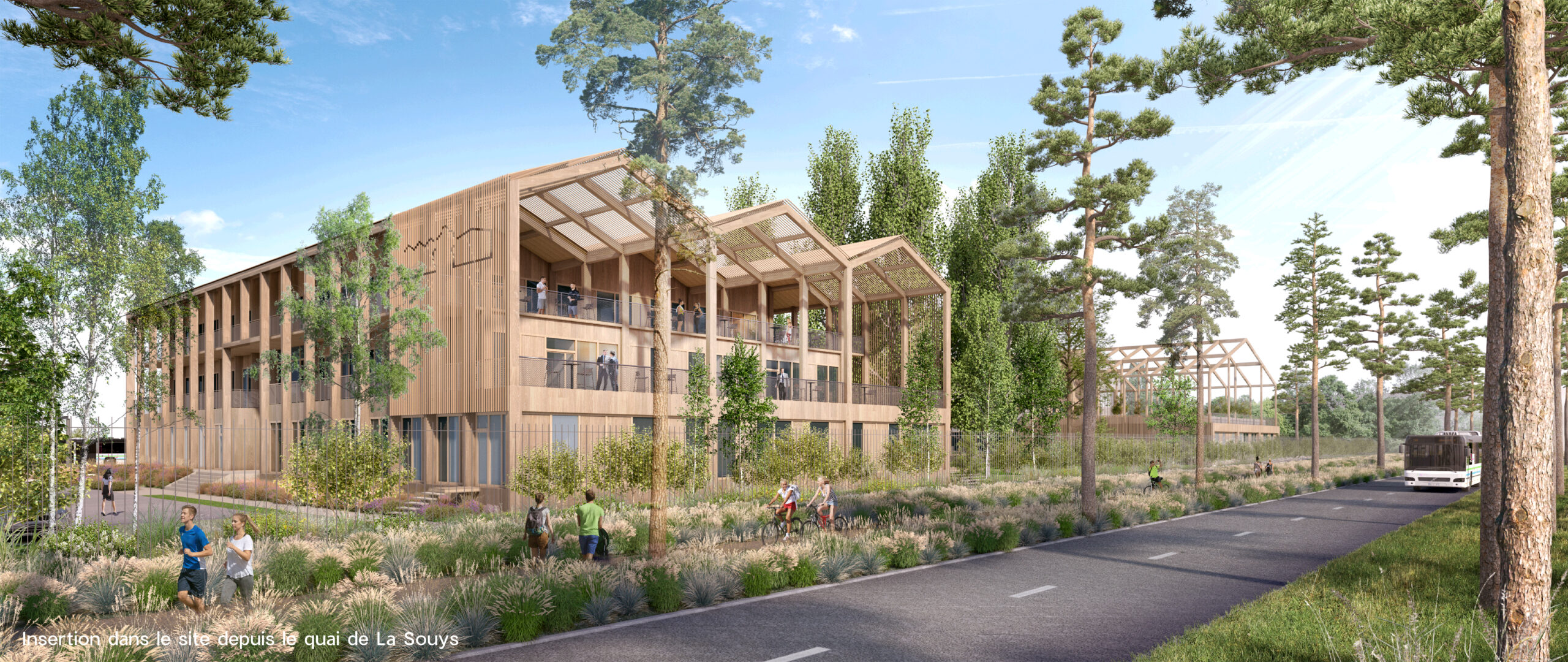 - A l’arrière, la plateforme de remisage est peu visible depuis l’espace public des quais, et une frange végétale adoucit sa perception depuis la rue Aristide Bergès. Les accès au site s’effectuent depuis cette même rue. L’accès principal pour les bus, les véhicules de services, les véhicules de livraison de la restauration est positionné au Nord-Est du site, au niveau de l’accès existant. Un accès réservé aux véhicules légers, aux cycles et aux piétons s’implante plus à l’Ouest, à proximité du futur Cours Simone Veil, favorisant les liaisons avec la voie de bus et les pistes cyclables longeant les quais de la Souys. C’est ainsi que le projet en cours de la Plaine Sud Garonne est envisagé pour prolonger la stratégie d’une rive conçue comme un vaste parc écologique ouvert à tous et où chacun pourra en toute liberté profiter de la nature et d’activités de déplacement doux, de détente et de loisir.