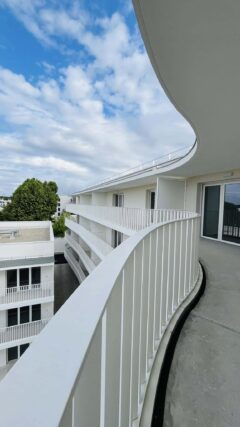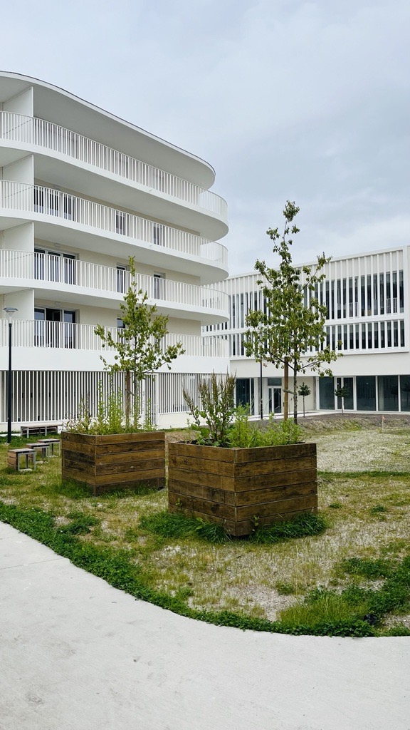 Posée sur un socle vitré, la silhouette de CEÏBA affiche une architecture légère alternant lignes verticales, courbes et arrondis dans une association de différentes matérialités. L’enveloppe extérieure se compose d’une vêture metallique faisant office de brise-vues pour les terrasses profondes qui se déroulent tels des rubans en enduits clairs sur le pourtour de la résidence. L’ensemble s’harmonise aussi en déclinant les tonalités de blancs renforçant l’épure et l’éclat de CEÏBA.