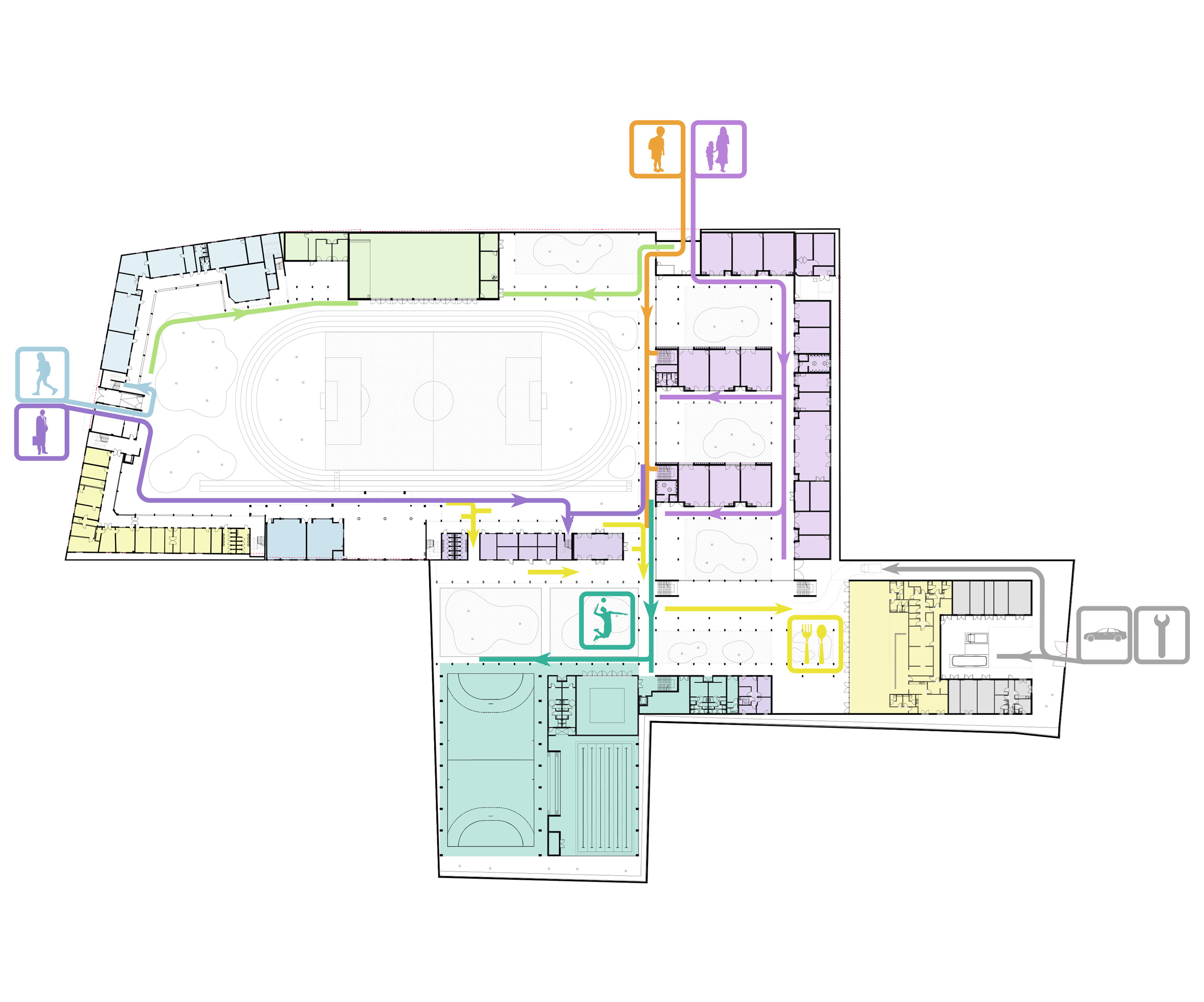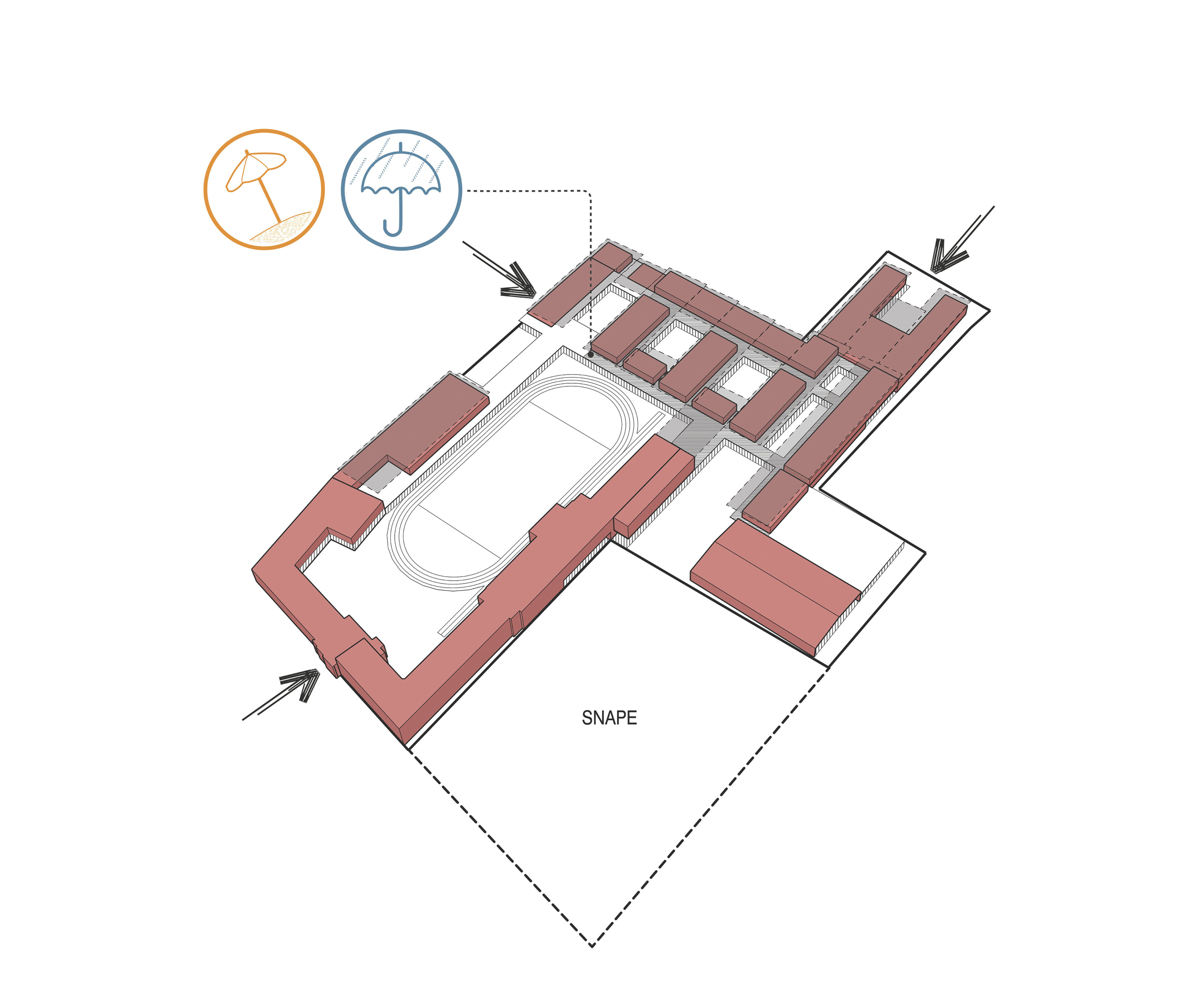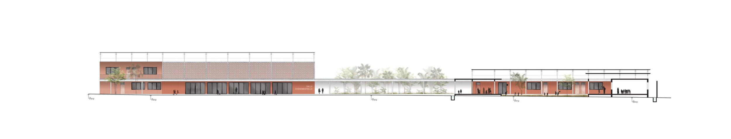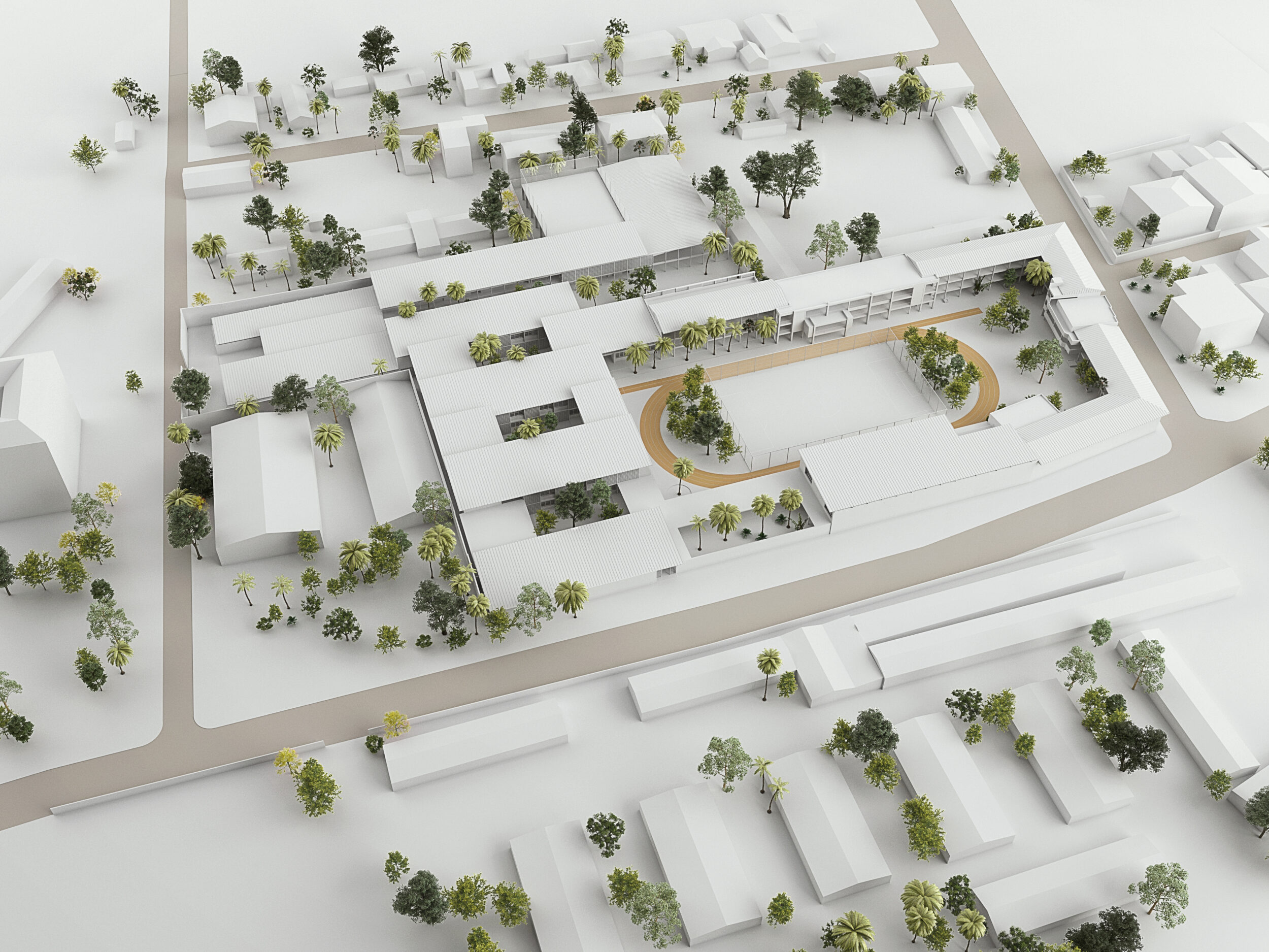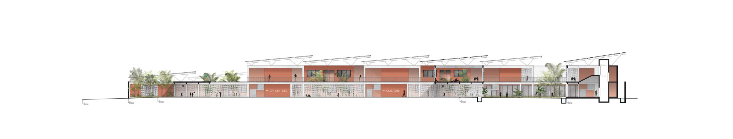 - En raison des conditions climatiques du site, les principaux facteurs qui ont déterminé la conception architecturale sont l’ensoleillement et les fortes pluies. En réponse à ces contraintes les volumes sont fragmentés et élevés en R+1 afin de créer des cours et des patios qui peuvent profiter de l’ombre portée par les bâtiments. De grandes toitures en pente, réalisées en bac acier, décollées du bâti, créent des combles largement ventilés et apportent de l’ombre aux volumes sous-jacents afin d’éviter la surchauffe des locaux. En continuité avec le mode constructif déjà engagé sur les bâtiments existants conservés, les façades sont rythmées et reliées entre elles avec un système de poteaux–poutres. Les espaces extérieurs ont été placés au centre de la conception architecturale car ils assurent le lien entre les différentes entités du complexe scolaire et garantissent l’intégration des bâtiments existants conservés avec les nouveaux. Le cœur de cet ensemble est fédéré autour du sport.