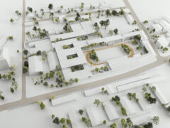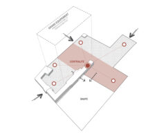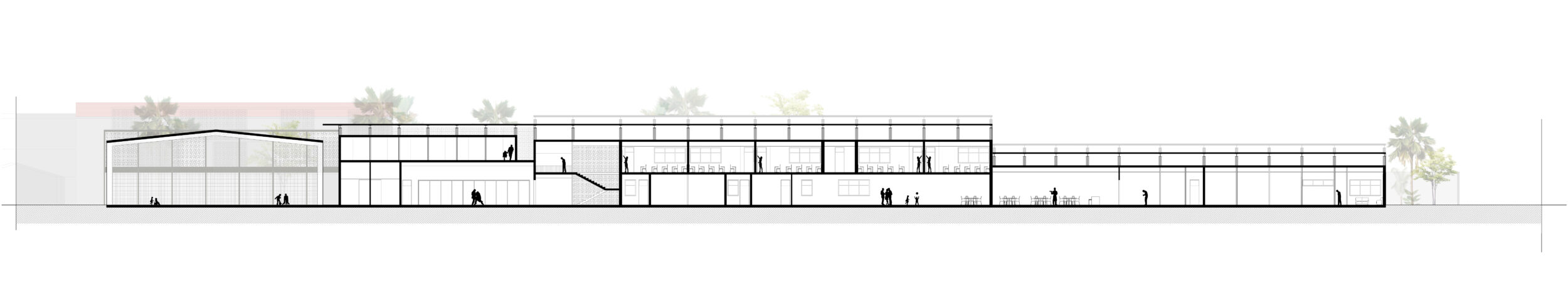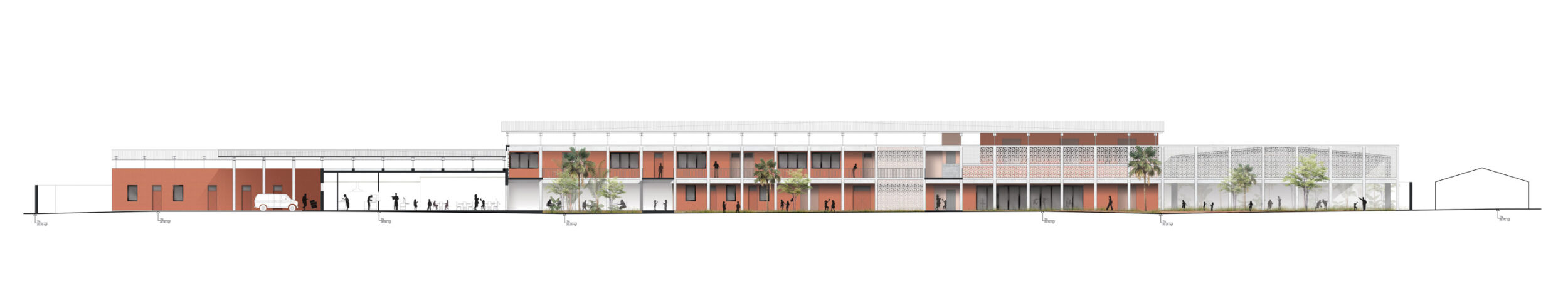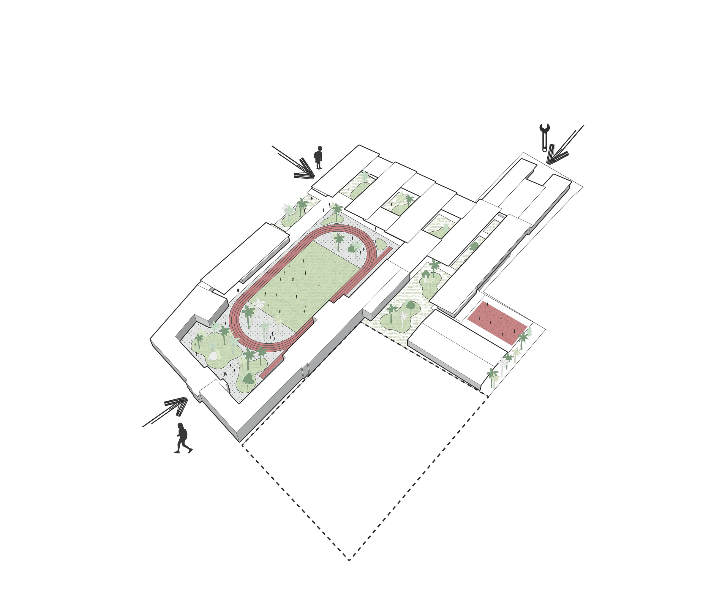 Le site du Lycée Français Albert Camus de Conakry se trouve au milieu d’un quartier résidentiel fragmenté et il est caractérisé par sa forme irrégulière due à la récente fusion de deux parcelles adjacentes. Le complexe du lycée est très reconnaissable dans l’ensemble du tissu urbain grâce à sa forme compacte et à son aspect extérieur uniforme. L’agrandissement du site, avec l’acquisition de la parcelle adjacente, a déterminé une réflexion globale sur l’établissement en vue de la croissance du nombre d’élèves attendus dans les années à venir. Sur la base de cette nouvelle vision, et de la volonté de donner au Lycée Français des équipements plus qualitatifs, la réflexion sur le projet a mené à la décision de repenser le site dans sa globalité en envisageant ainsi la démolition des bâtiments jugés obsolètes ou inadéquats pour la bonne pratique des activités scolaires. En réponse au souhait de donner un caractère unitaire au site et de réunir les anciens bâtiments conservés avec les nouveaux ; le projet a été développé autour deux grands espaces ouverts reliés par un axe de distribution. Tout le long de ce parcours couvert on accède aux différents corps de bâtiments : la salle évènementielle et le pôle primaire, les classes de l’école élémentaire, la grande cour du secondaire avec l’anneau d’athlétisme et le terrain de mini-foot, le centre de gravité, la cour de l’école élémentaire pour atteindre enfin le pôle sportif et la restauration.