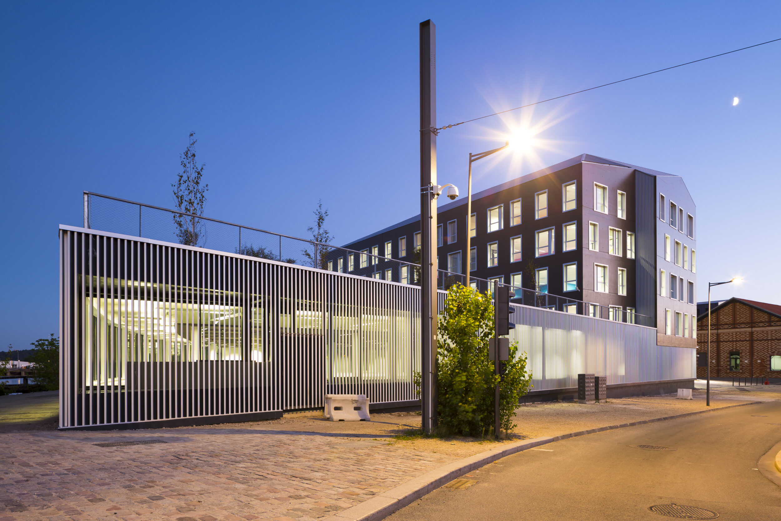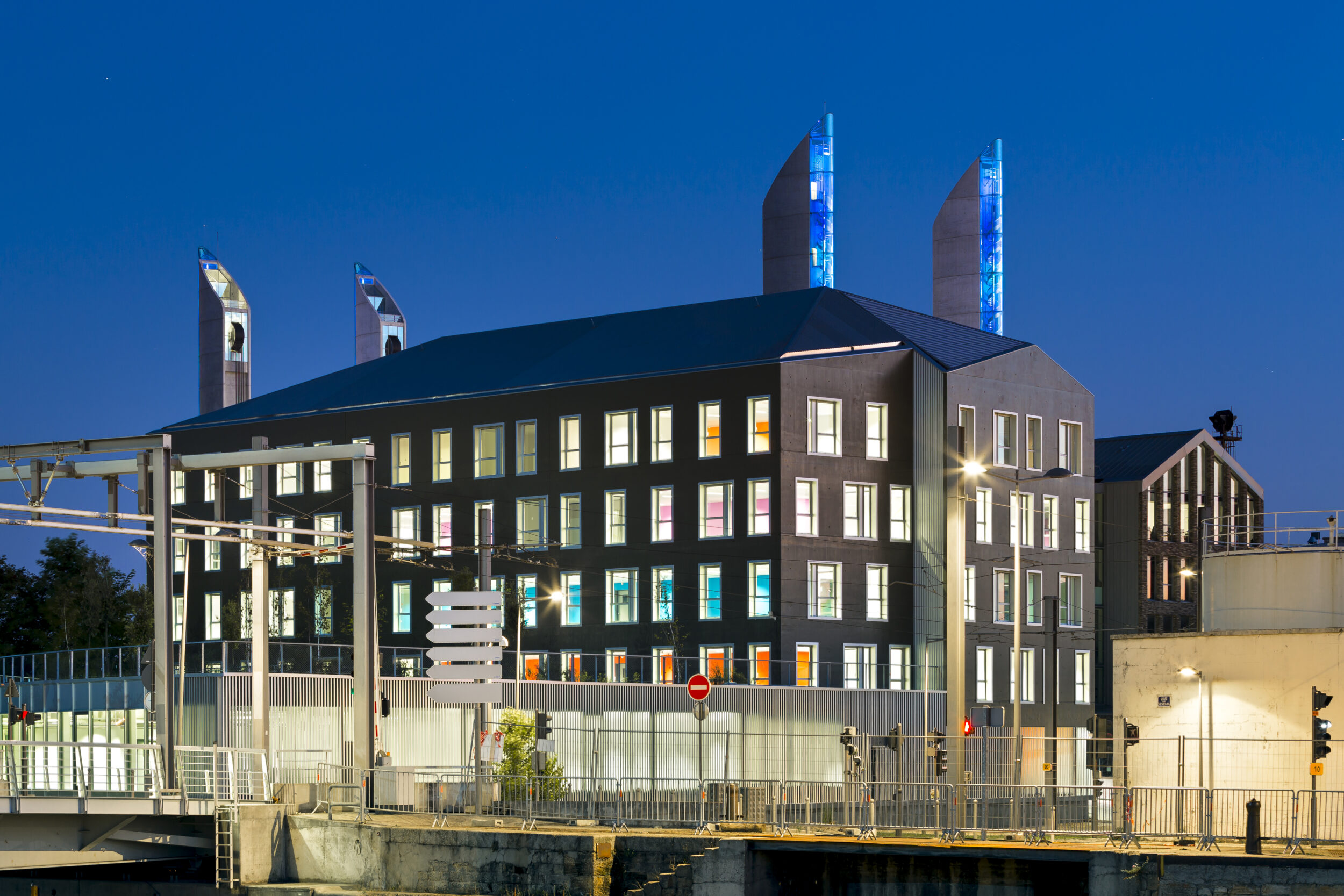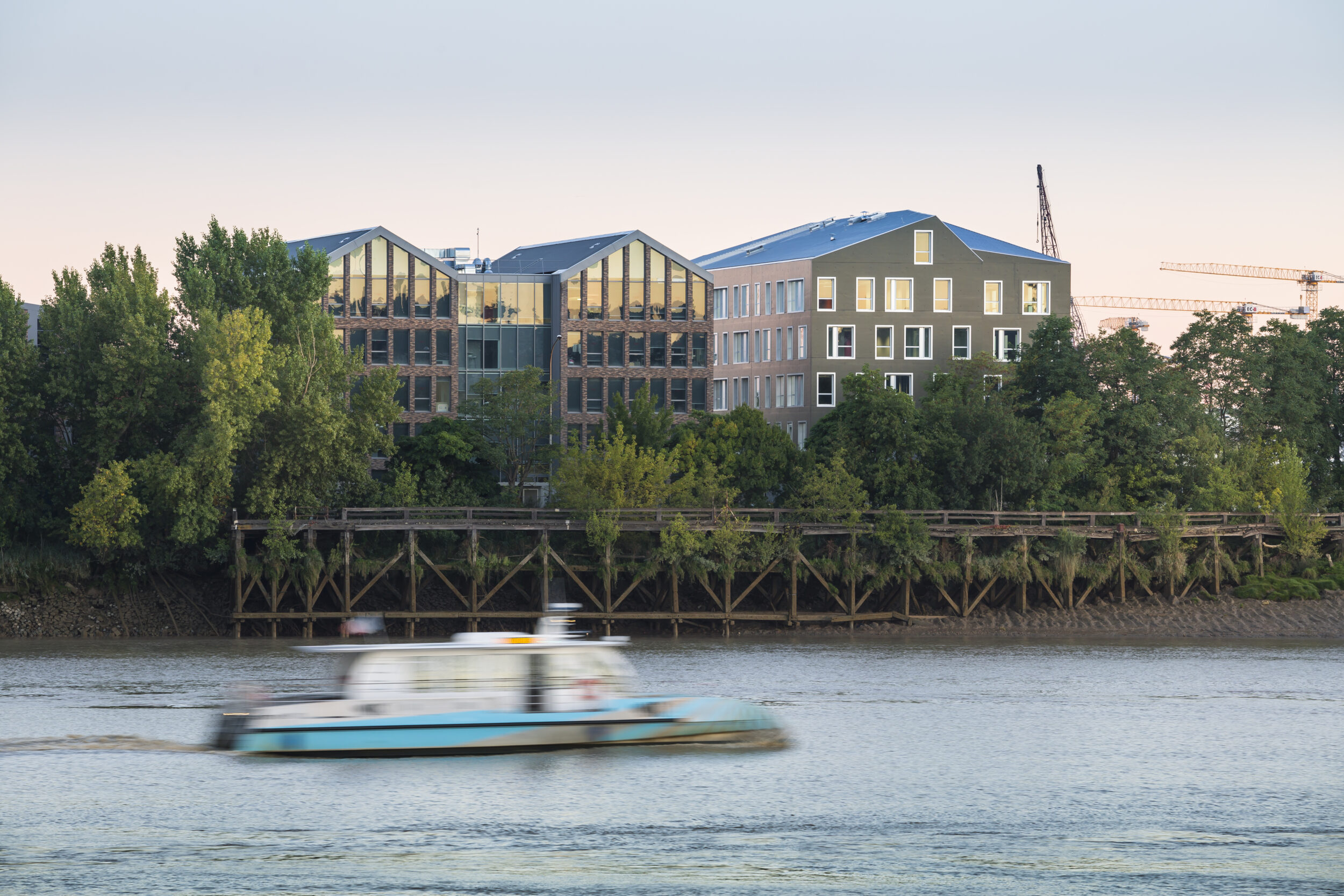 Le rez-de-chaussée du bâtiment tertiaire entièrement vitré épouse le dessin particulier du site. Au dessus de ce volume d’assise, le bâtiment en superstructure s’inspire de la logique portuaire du site et s’étire perpendiculairement aux quais, dans un double parallélépipède aux toitures inclinées, reprenant la morphologie particulière des édifices voisins. A l’intérieur, le grand volume épousant la courbe fluviale, permet de profiter au mieux du paysage du fleuve pour les espaces de plateaux paysagés. Aux étages, l’organisation plus conventionnelle de l’édifice autorise des configurations en plateaux libres ou cloisonnés. Chaque niveau est organisé comme un espace ouvert. Le toit du rez-de-chaussée incurvé est un jardin qui, vu d’en haut, semble se fondre dans le paysage environnant.