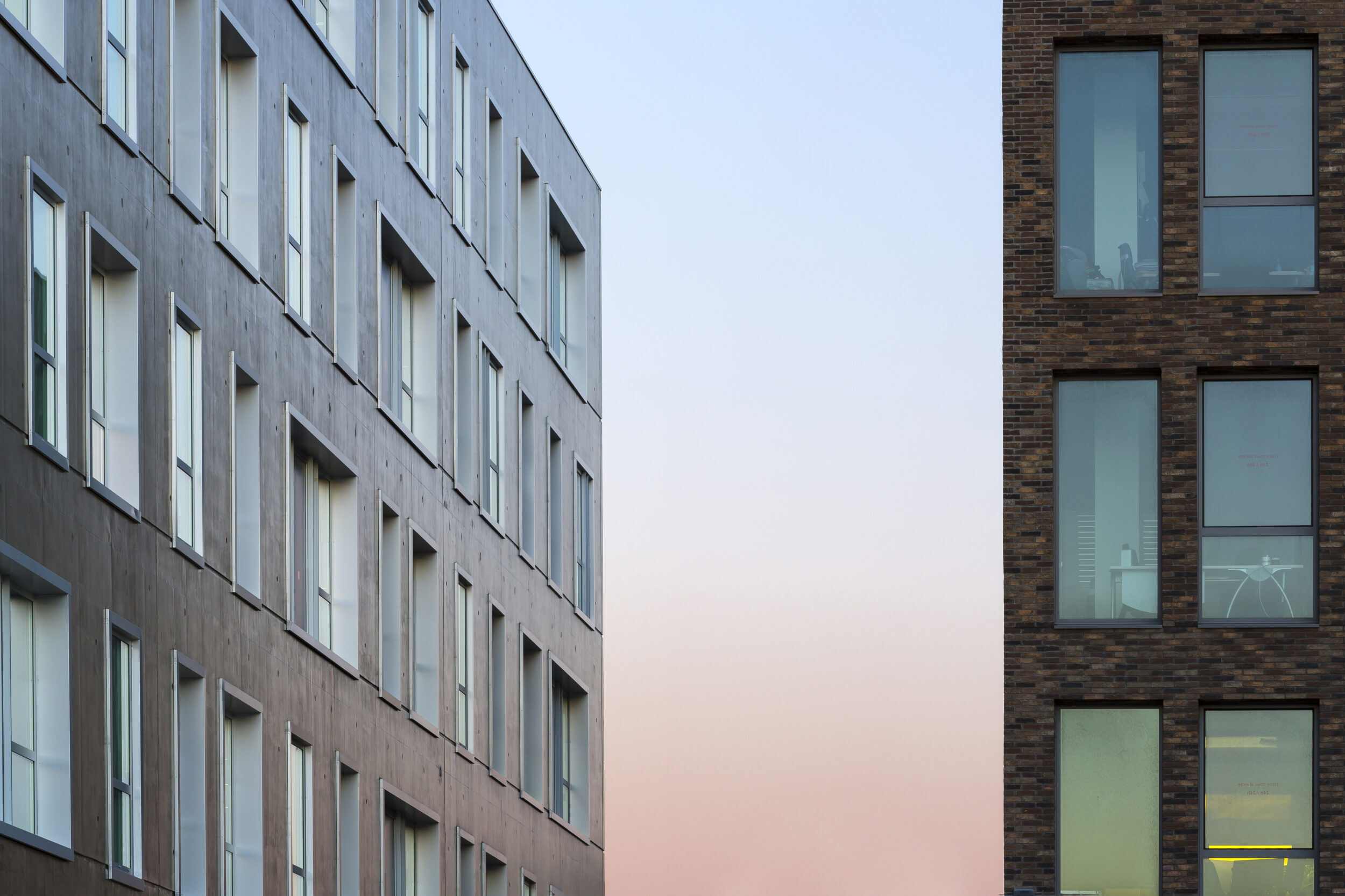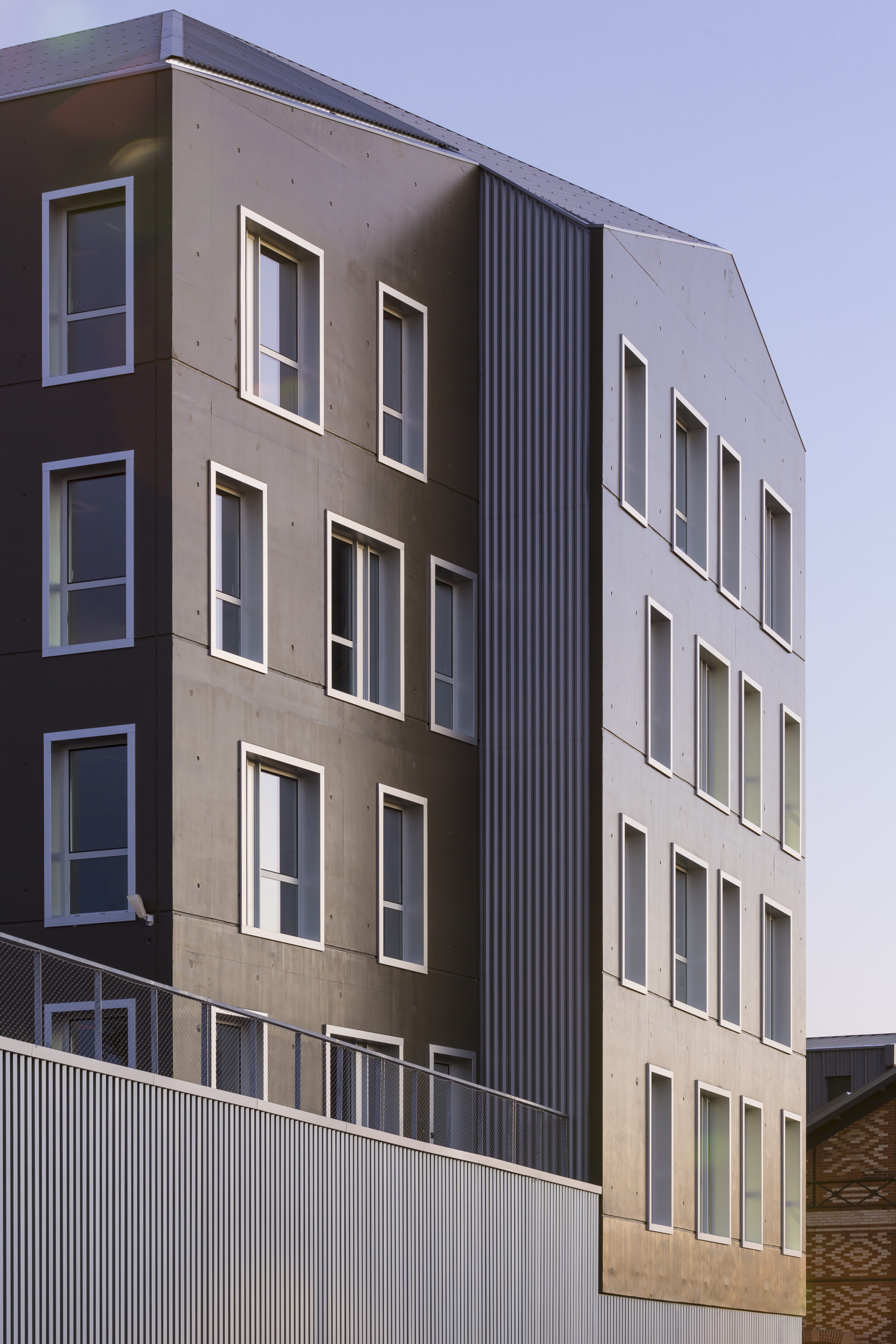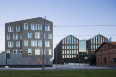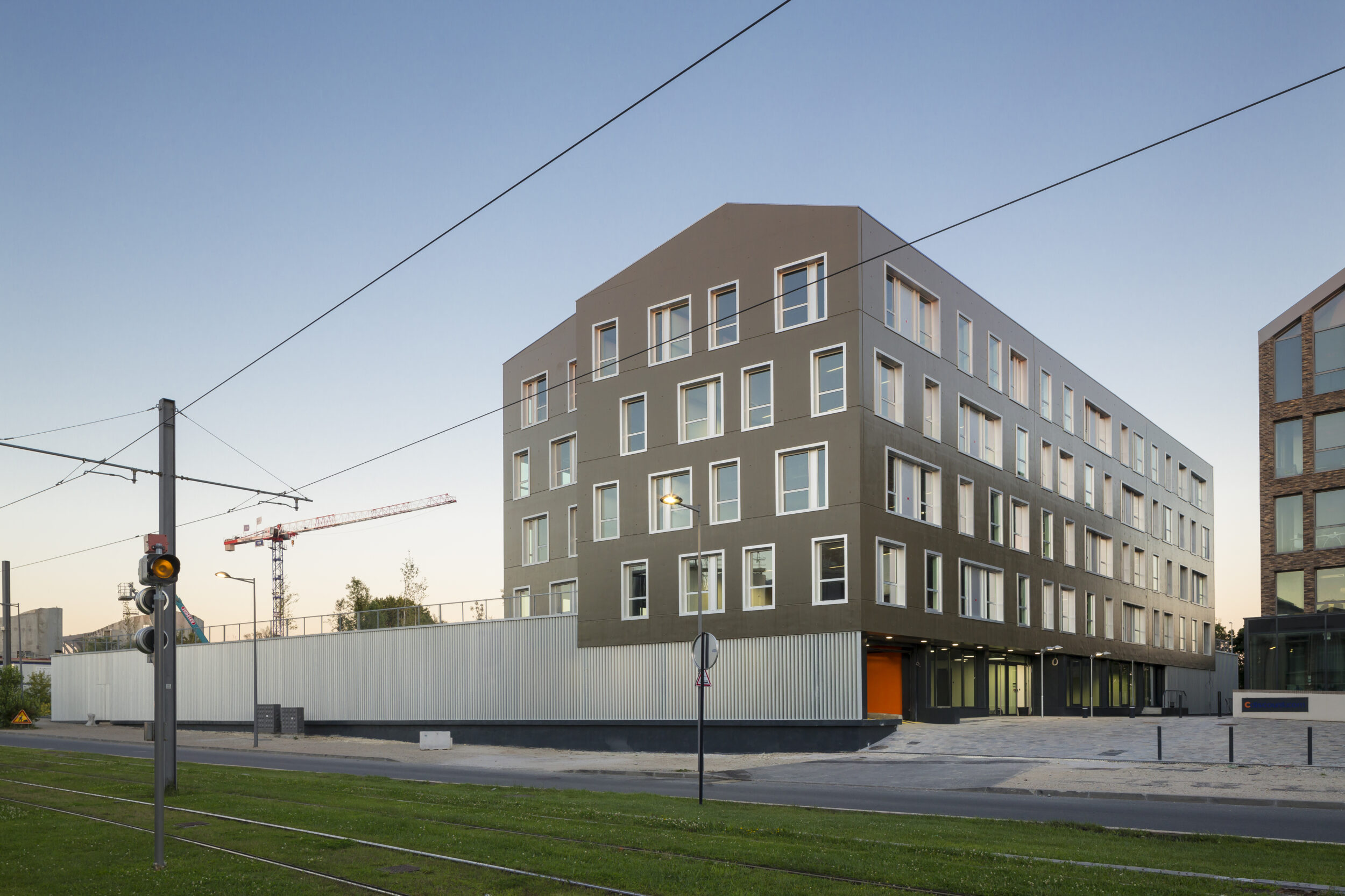 Le rez-de-chaussée du bâtiment tertiaire entièrement vitré épouse le dessin particulier du site. Au dessus de ce volume d’assise, le bâtiment en superstructure s’inspire de la logique portuaire du site et s’étire perpendiculairement aux quais, dans un double parallélépipède aux toitures inclinées, reprenant la morphologie particulière des édifices voisins. A l’intérieur, le grand volume épousant la courbe fluviale, permet de profiter au mieux du paysage du fleuve pour les espaces de plateaux paysagés. Aux étages, l’organisation plus conventionnelle de l’édifice autorise des configurations en plateaux libres ou cloisonnés. Chaque niveau est organisé comme un espace ouvert. Le toit du rez-de-chaussée incurvé est un jardin qui, vu d’en haut, semble se fondre dans le paysage environnant.