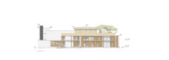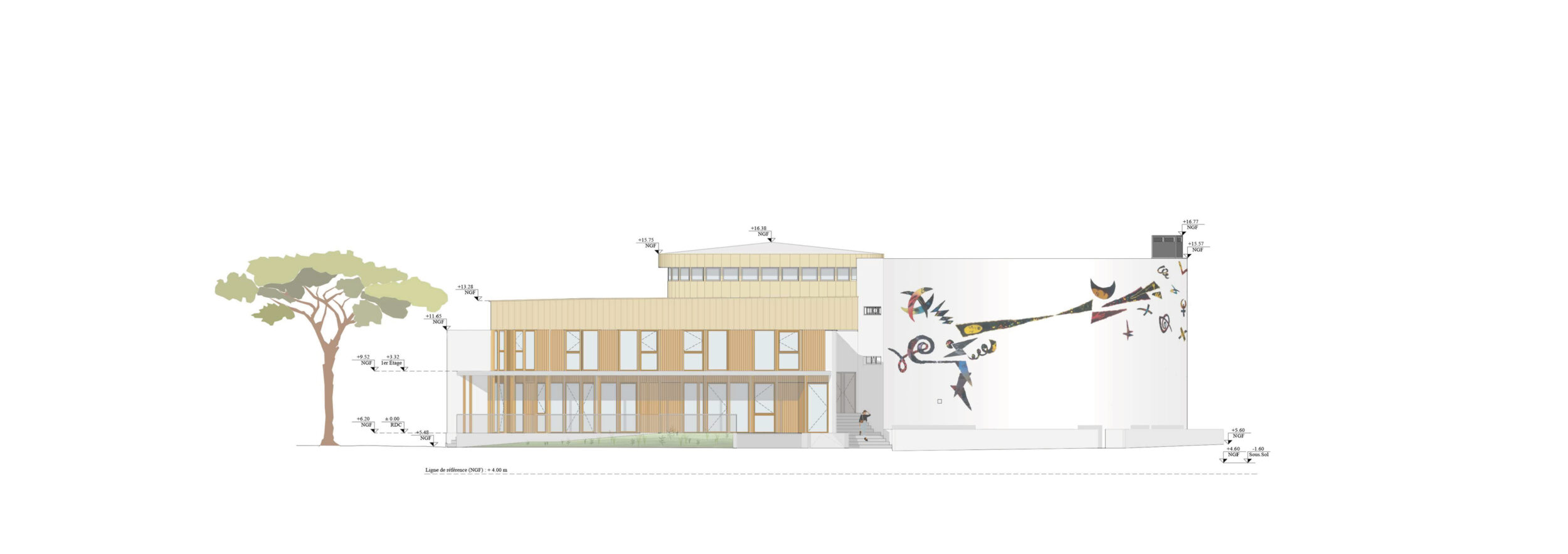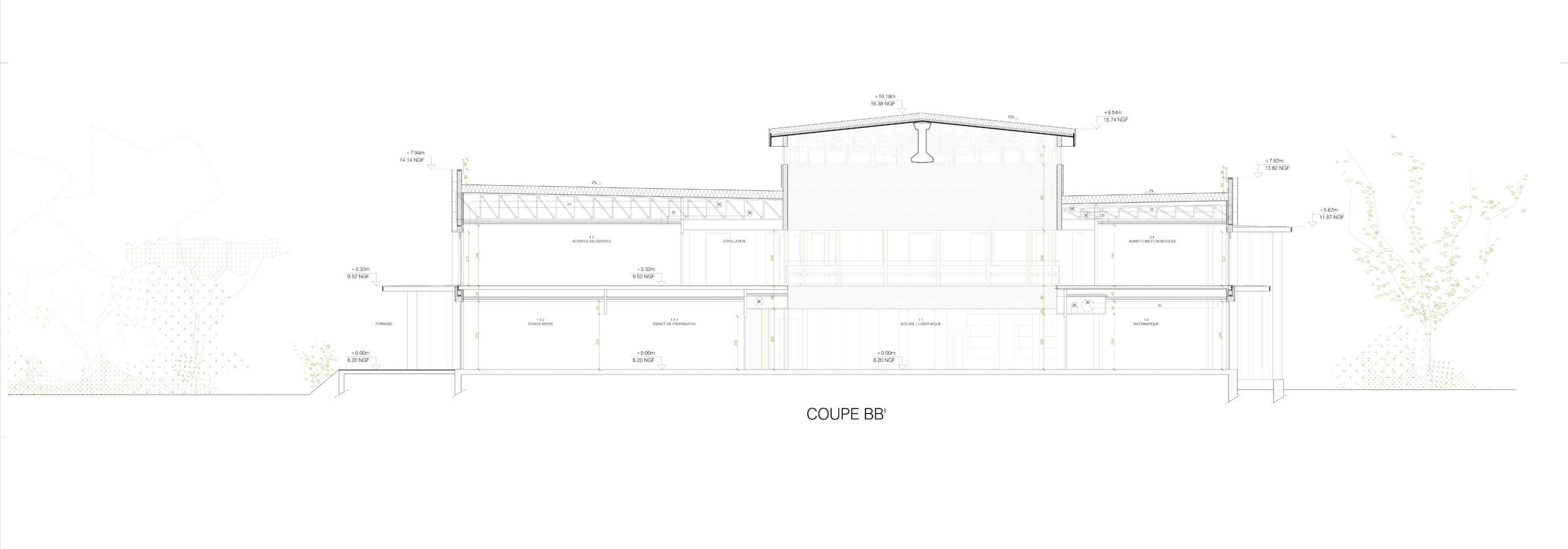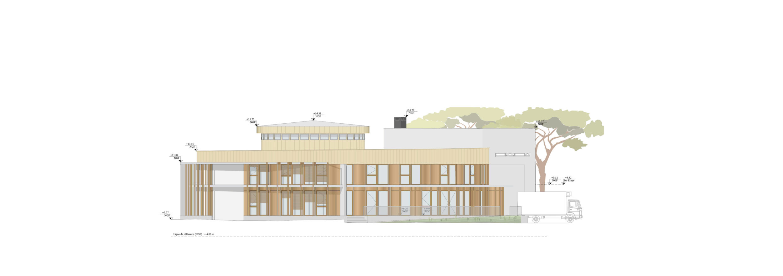 Le bois, matériau organique et renouvelable, issu de filières françaises, s’est imposé comme un choix idéal. Il est associé à des matériaux durables et sobres tels que le zinc laqué, l’aluminium pour les brise-soleil et la chaux pour la réhabilitation de certains murs existants. Le réemploi de nombreux éléments (sols, plafonds, structures) s’inscrit dans une démarche responsable et vertueuse.