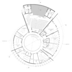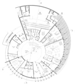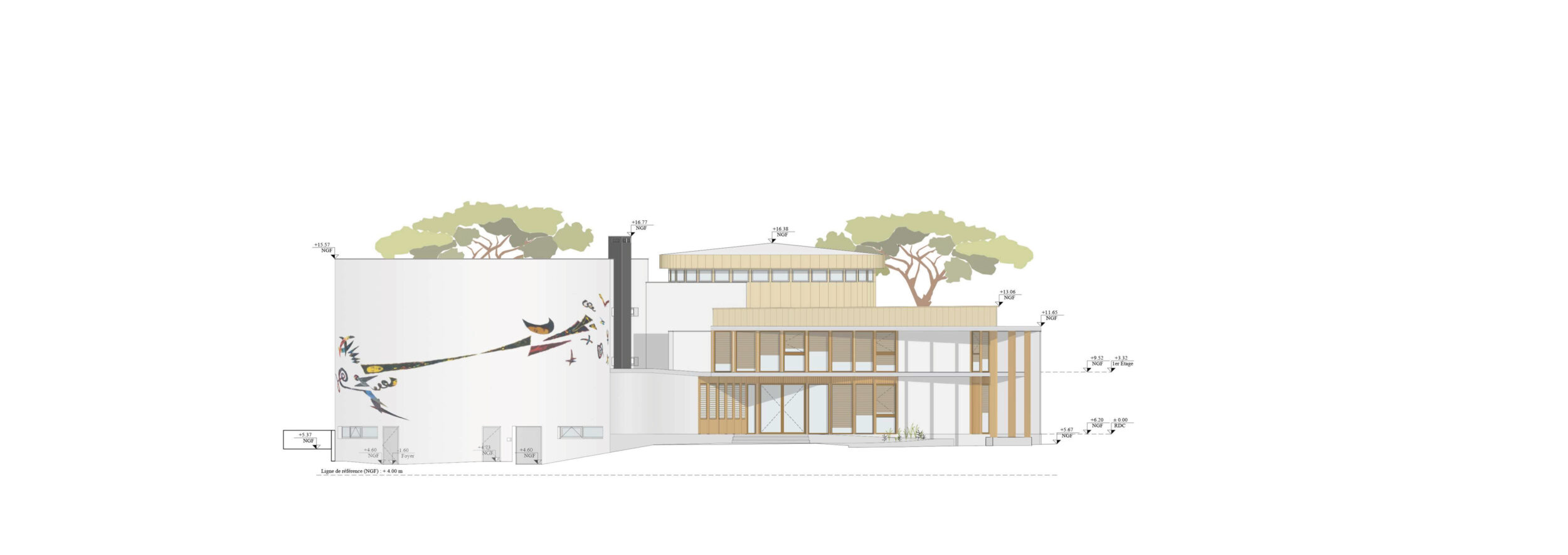 La « coquille de l’escargot » constitue un enjeu majeur du projet. L’enveloppe est entièrement repensée pour améliorer les performances thermiques et le confort d’été, tout en conservant la lecture de la façade d’origine. Des casquettes solaires hélicoïdales et une coursive périphérique en bois ceinturent le bâtiment, créant une protection solaire efficace et une transition douce entre intérieur et extérieur. Les façades combinent murs ossature bois, larges surfaces vitrées et protections solaires adaptées à chaque orientation.