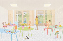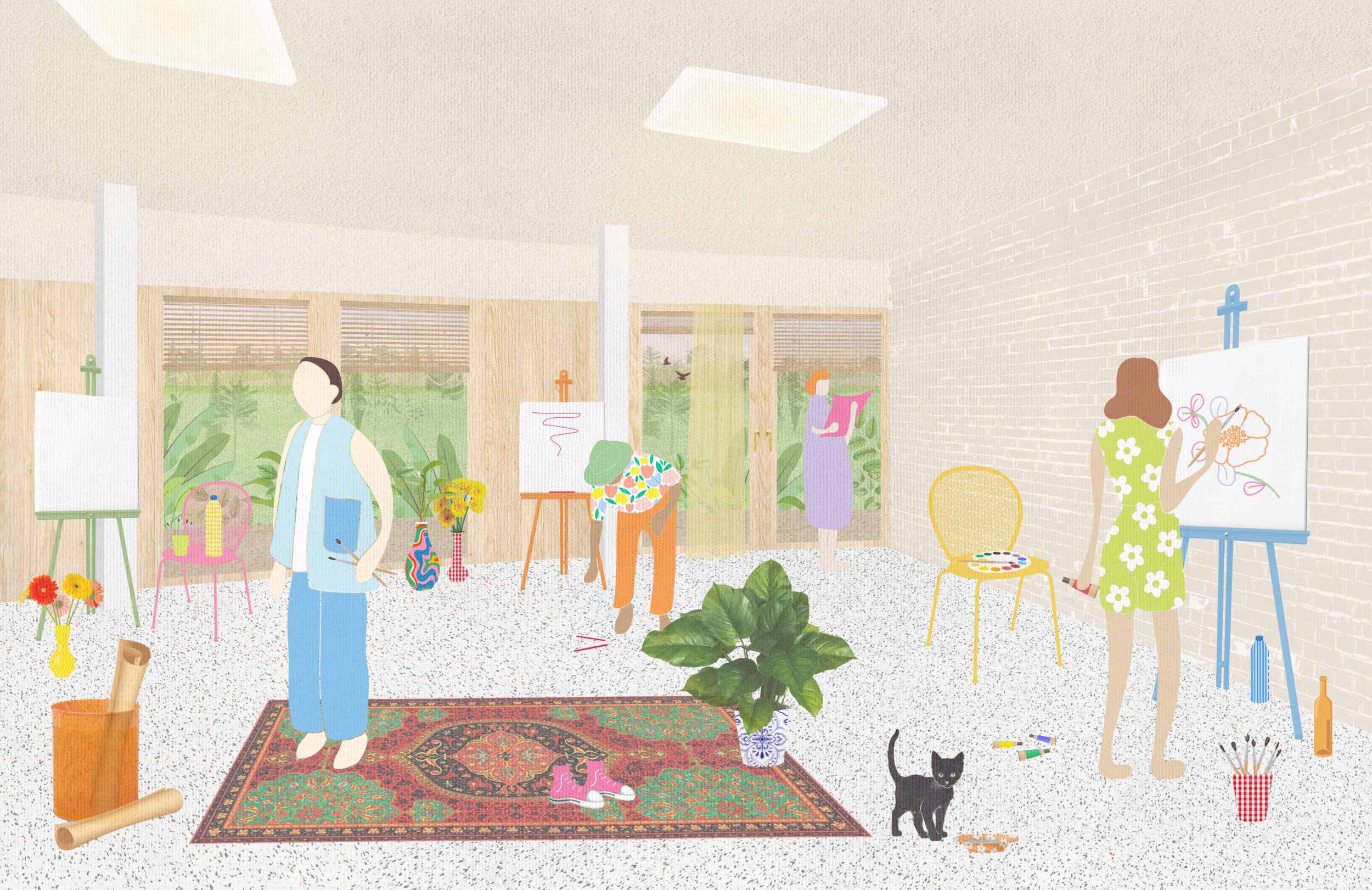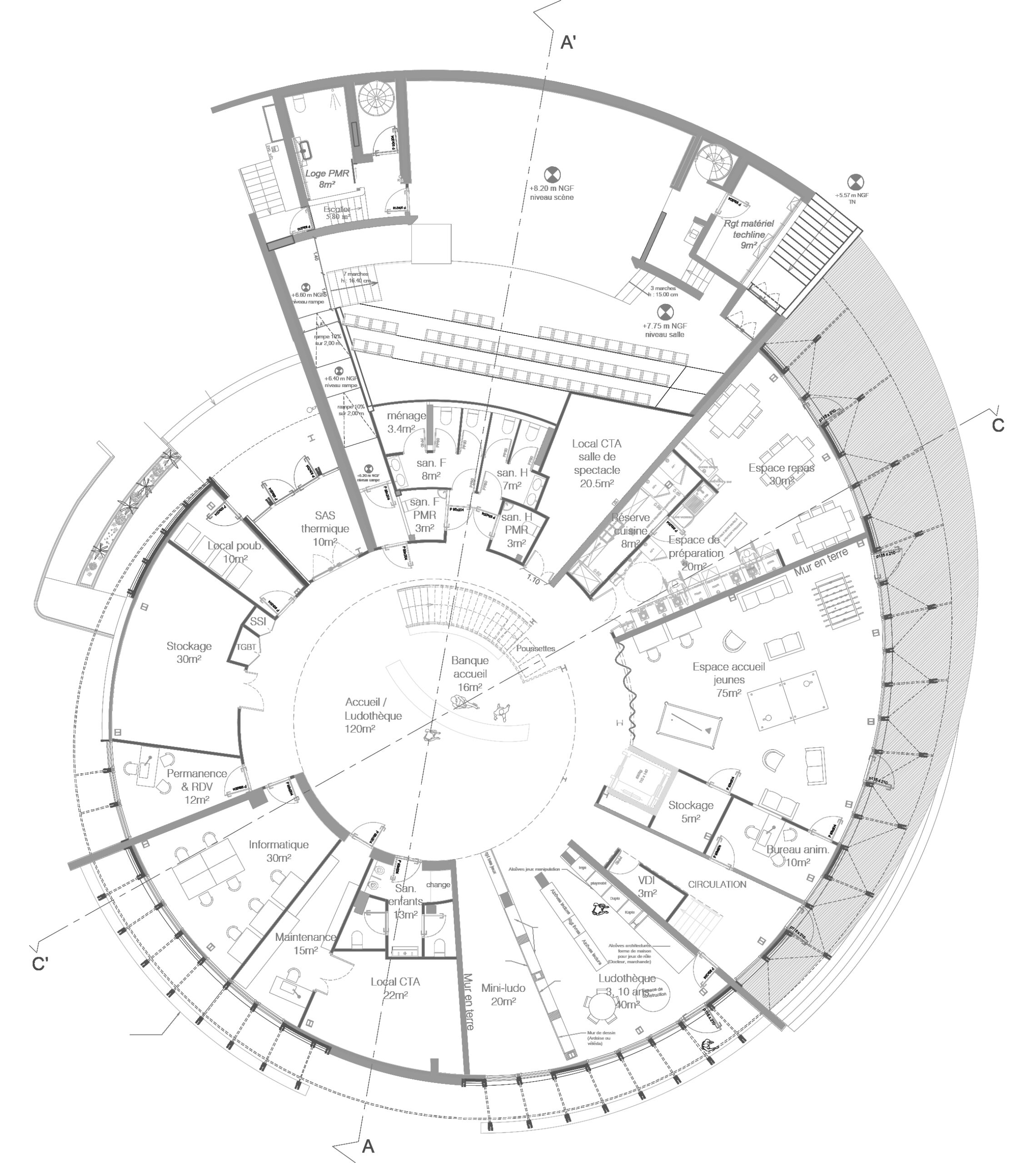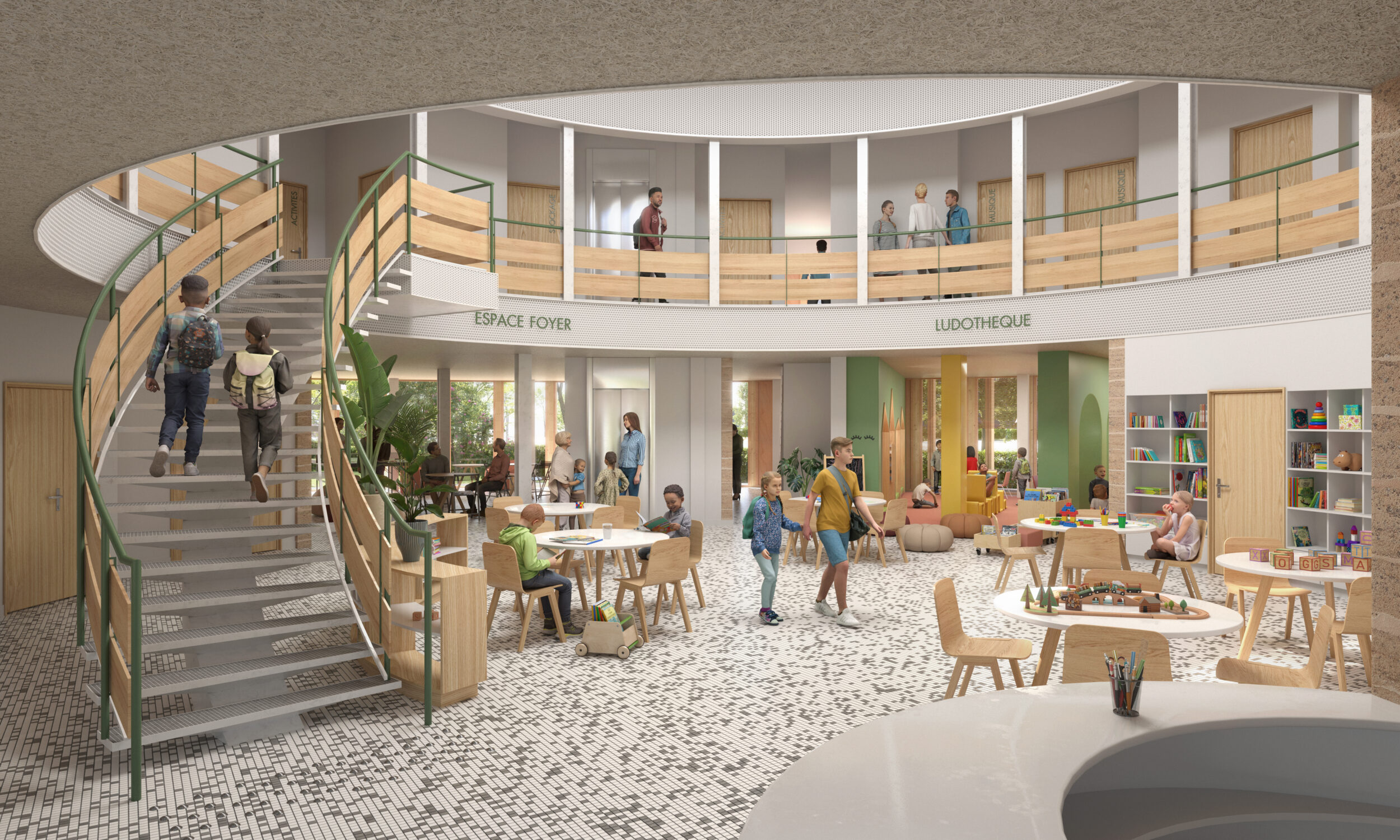 Les espaces intérieurs sont organisés autour d’un atrium central, pensé comme un espace chaleureux, lumineux et fédérateur. Riche en propositions visuelles et sensorielles, il distribue l’ensemble des fonctions du centre et favorise les vues, la transparence et la modularité. Chaque espace – ludothèque, espace jeunes, cuisine, salles d’activités, pôle administratif, salle de spectacle – est conçu selon ses usages spécifiques, avec une attention particulière portée à l’acoustique, à la flexibilité et à la qualité des ambiances.