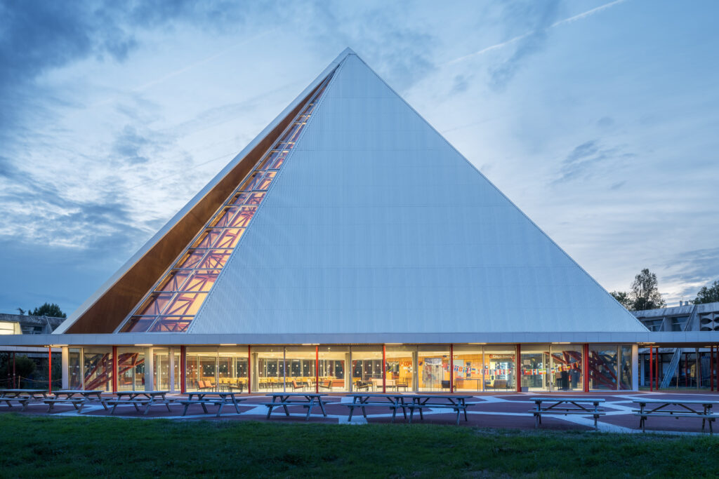 Afin de reprendre les sensations graphiques recueillies sur site, ce projet de collège se compose d’un équilibre entre deux matériaux : un socle solide, minérale en béton lasuré pour obtenir un coloris en harmonie avec l’environnement et un bardage métallique de type tôle ondulée pour l’étage plus léger. Les toitures en pentes sont habillées par un tapis végétal afin de renforcer l’intégration au site. Le collège s’articule autour de la cour de récréation. Celle-ci, profitant de la topographie, s’ouvre en belvédère sur le terrain de foot. Ce talus, planté et arboré, forme une limite naturelle entre la partie enseignement et le secteur de la pratique sportive. Les fonctions du collège sont disposées en U englobant la cour. L’entrée est située à l’angle des bâtiments sur rue, au centre des fonctions qu’elle dessert.