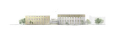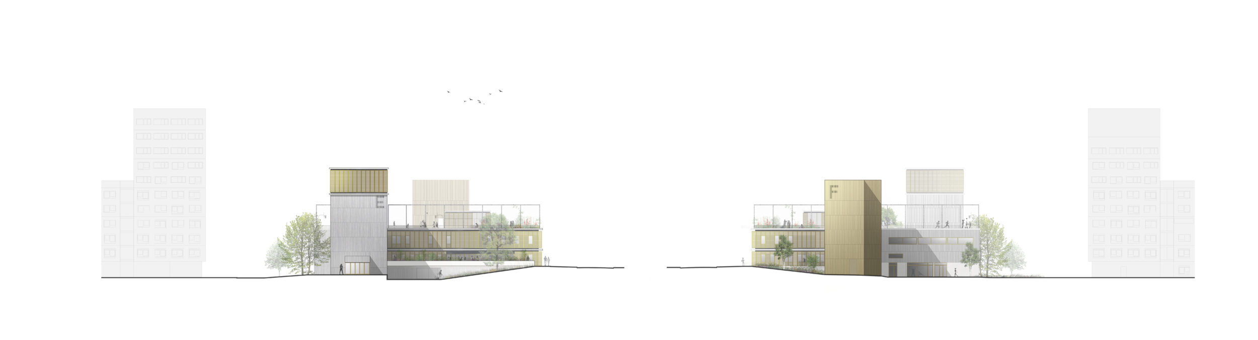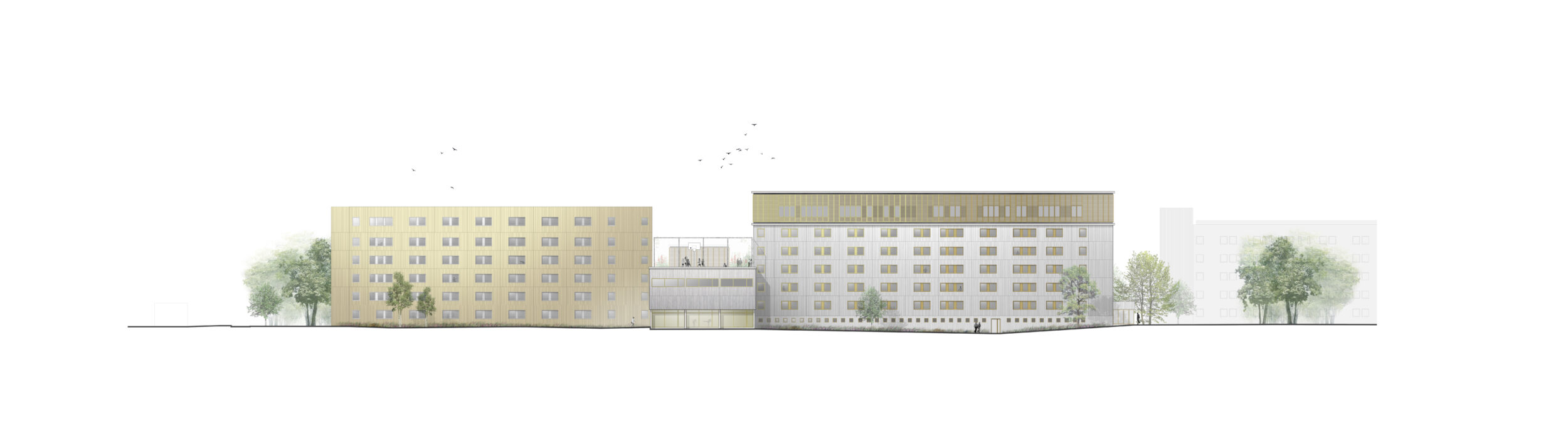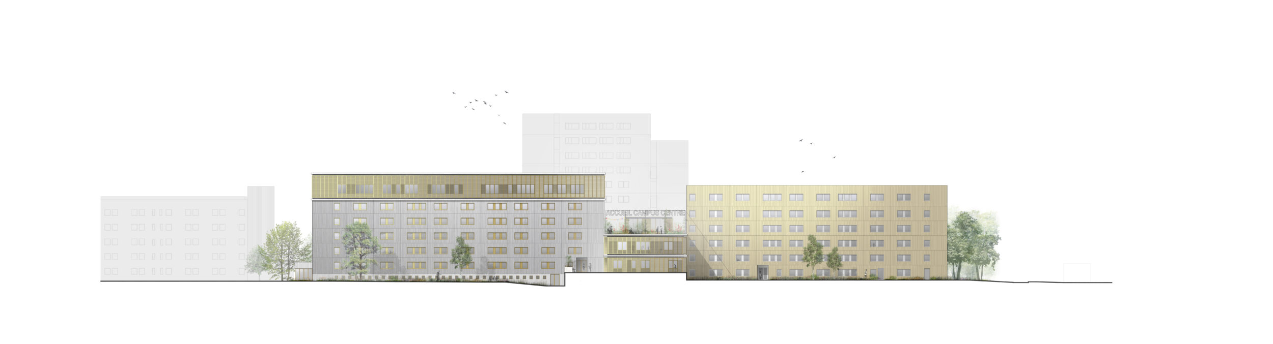 Une première volonté du projet est de respecter la logique d’origine d’épannelage des édifices avec des bâtiments d’hébergement formant de hauts parallélépipèdes étirés et des bâtiments annexes moins hauts. Cette logique permettant de ménager des césures dans la lecture du volume général et la volonté de préserver l’aspect paysager et les arbres remarquables a conduit l’étirement du bâtiment à réaliser un étage légèrement enterré, comme un parvis abritant le stationnement. Pour les deux volumes de logements, les façades sont revêtues d’un bardage nervuré dont les teintes gris argent et bronze s’apparentent à celles des résidences voisines. Malgré leurs surfaces réduites, chaque logement est étudié afin de proposer une spatialité la plus pratique et agréable possible.