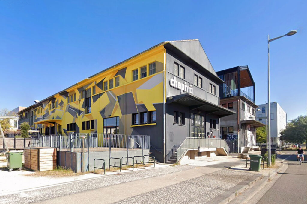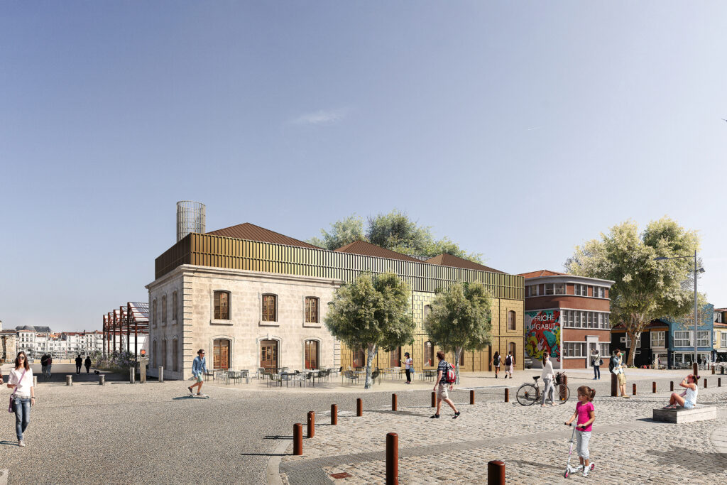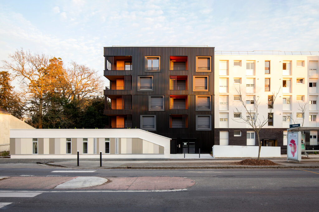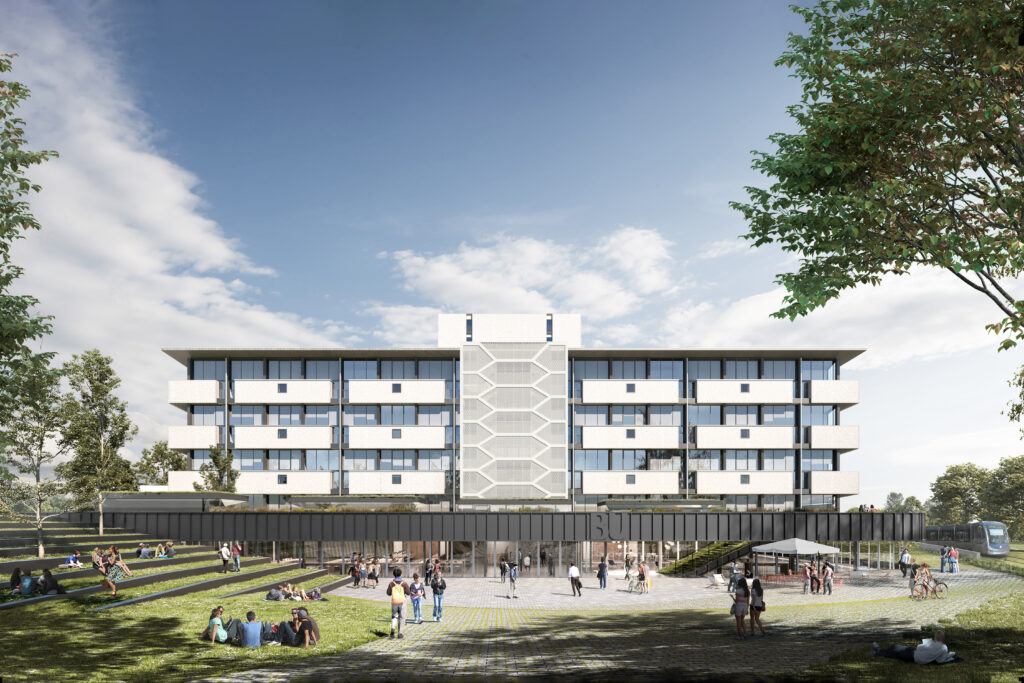 Le bâtiment existant conserve, quant à lui, son écriture fonctionnelle, et l’horizontalité marquée de ses bandeaux de fenêtres.