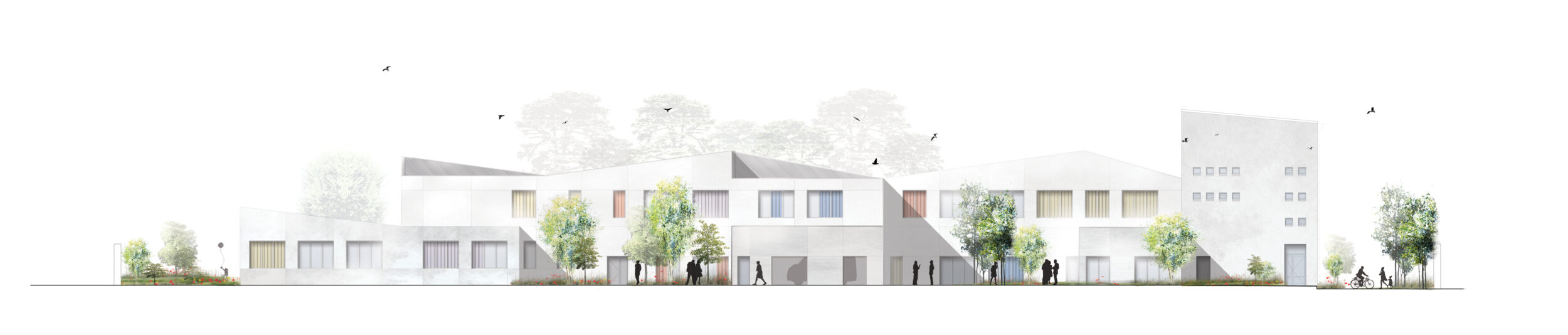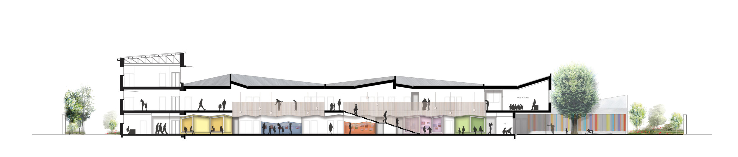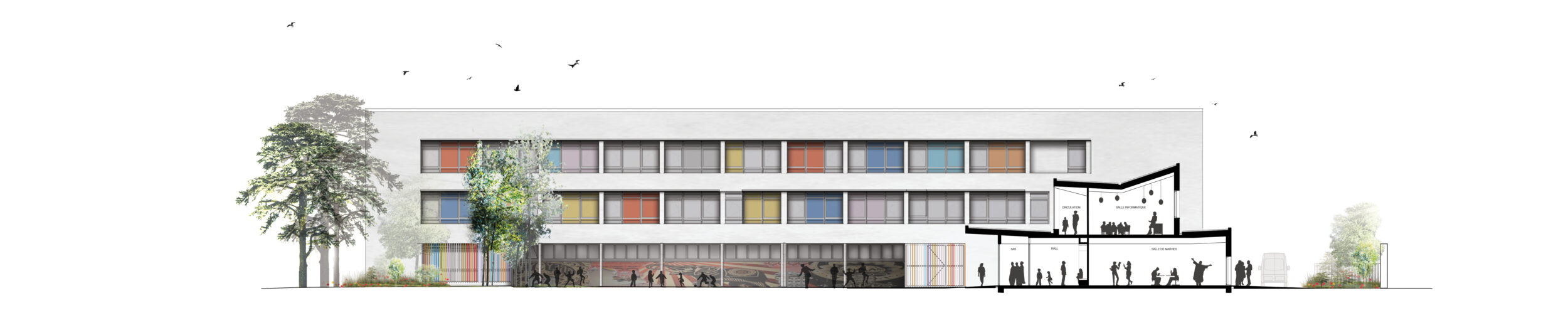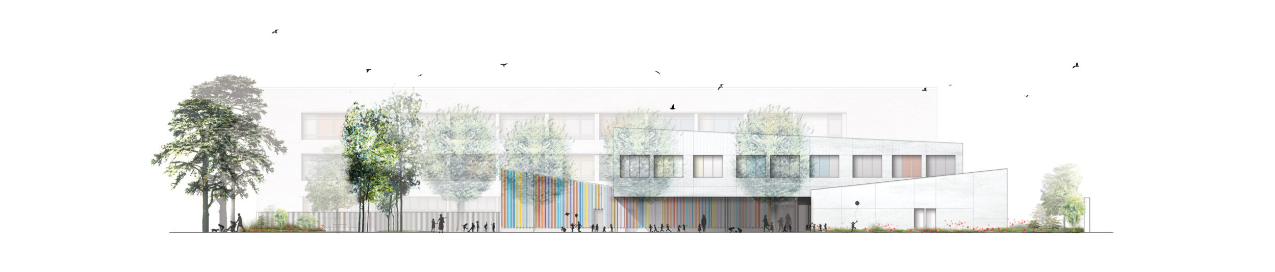 En contrepoint de la rigidité du parallélépipède existant, l’aile nouvelle juxtapose une série de volumes aux toitures plissés, aux façades décalées, formalisant un assemblage de «maisonnées» s’inscrivant en douceur dans le site et offrant un repère domestique à ses jeunes usagers. Au droit des espaces libres des cours, les façades du rdc s’habillent d’une résille de tubes colorées, protégeant les vitrages et dynamisant les volumes de l’effet graphique d’une déclinaison de teintes vives. A l’étage, les élévations en retrait, surplombant le hall, s’habillent de verre translucide, s’effaçant au profit du découpage graphique et coloré du niveau d’assise.