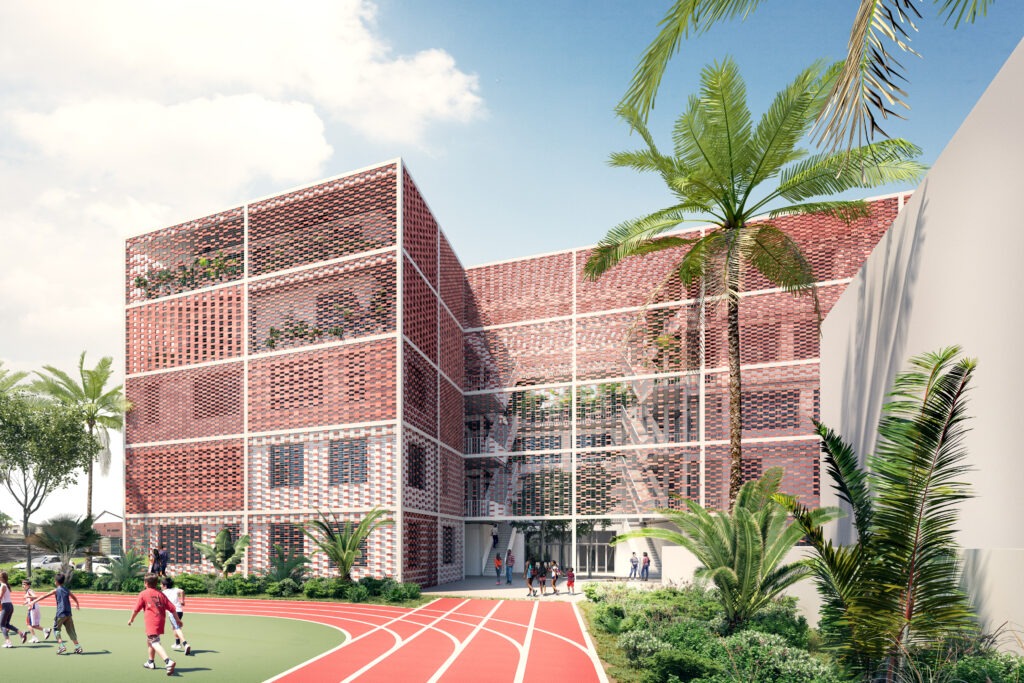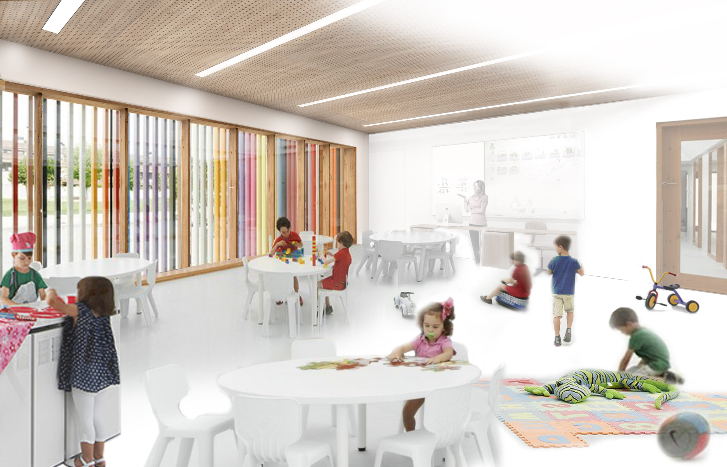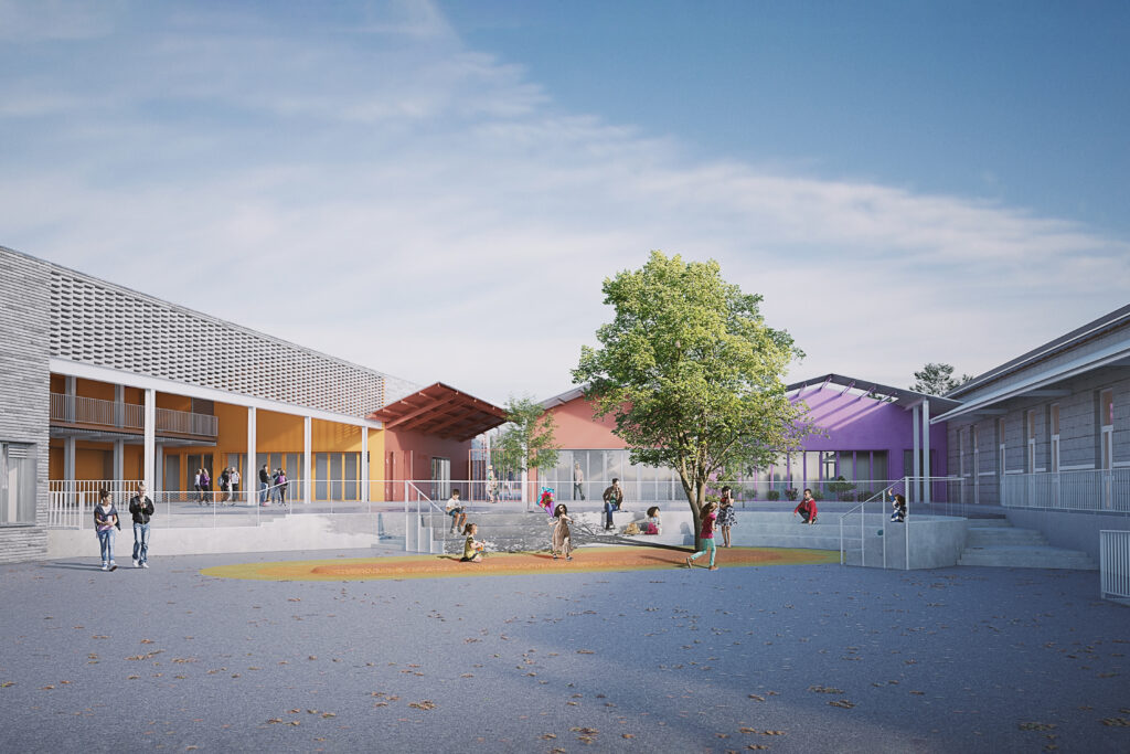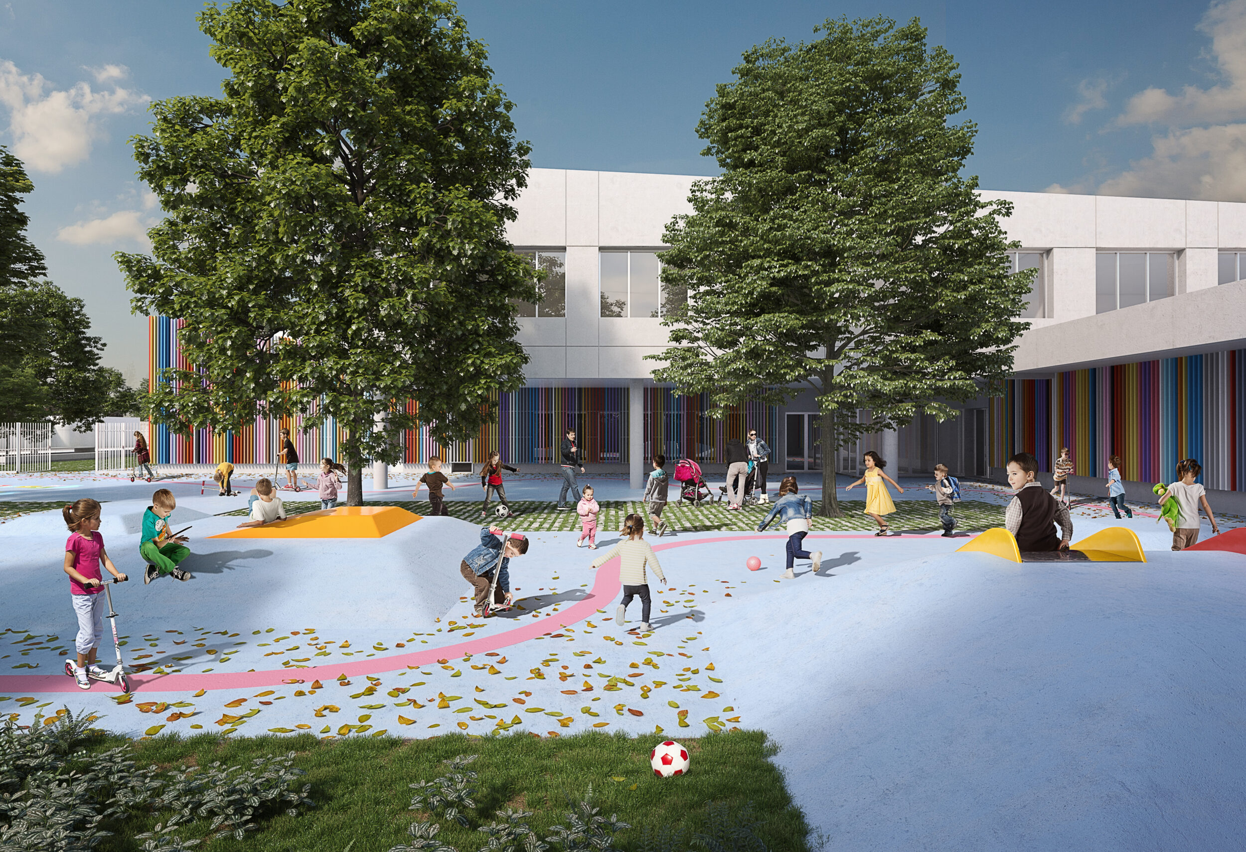 En contrepoint de la rigidité du parallélépipède existant, l’aile nouvelle juxtapose une série de volumes aux toitures plissés, aux façades décalées, formalisant un assemblage de «maisonnées» s’inscrivant en douceur dans le site et offrant un repère domestique à ses jeunes usagers. Au droit des espaces libres des cours, les façades du rdc s’habillent d’une résille de tubes colorées, protégeant les vitrages et dynamisant les volumes de l’effet graphique d’une déclinaison de teintes vives. A l’étage, les élévations en retrait, surplombant le hall, s’habillent de verre translucide, s’effaçant au profit du découpage graphique et coloré du niveau d’assise.