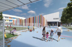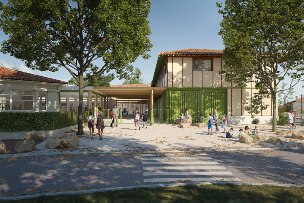 La façade d’entrée, largement visible et dégagée depuis l’espace des cours, depuis la traversée piétonne de l’îlot offre ainsi une écriture identitaire totalement renouvelée d’un équipement public dédié à l’enfance, d’un univers accueillant et coloré que complète le traitement paysagé des espaces récréatifs.