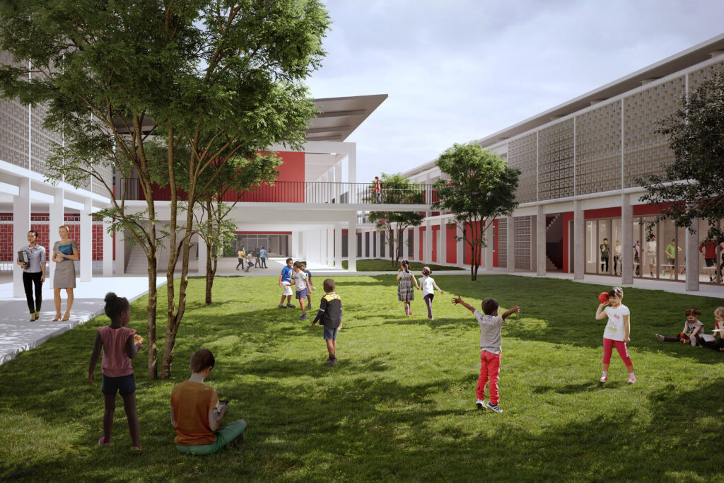 L’organisation du programme est simple et lisible : le nouvel édifice s’articule autour d’un vaste Hall linéaire, qui relie les 3 accès distincts de l’école. L’espace restauration occupe une position centrale, à l’interface entre les deux cours et les deux sections du groupe scolaire.