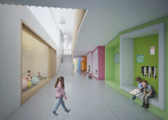 Si l’écriture de la découpe des façades est soulignée d’une polychromie qui identifie l’édifice, les espaces intérieurs sont traités de manière plus neutre, associant des tons clairs et naturels pour obtenir une ambiance sereine.