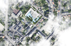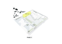La reconversion de cette allée en cheminement public, l’orientation du terrain, incitent à constituer un ensemble bâti en équerre autour du vide des cours. Cette équerre est formée du volume existant, complétée perpendiculairement par un nouvel édifice, dont les façades principales s’ouvrent, au Sud-Ouest, sur les cours et l’allée plantée. Edifié en R+1 partiel, le nouveau bâtiment dessine un fond de scène fragmenté et animé, depuis le chemin sous les cèdres et les accès vers le groupe scolaire.