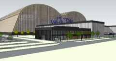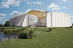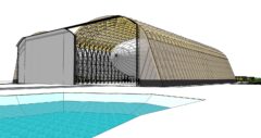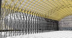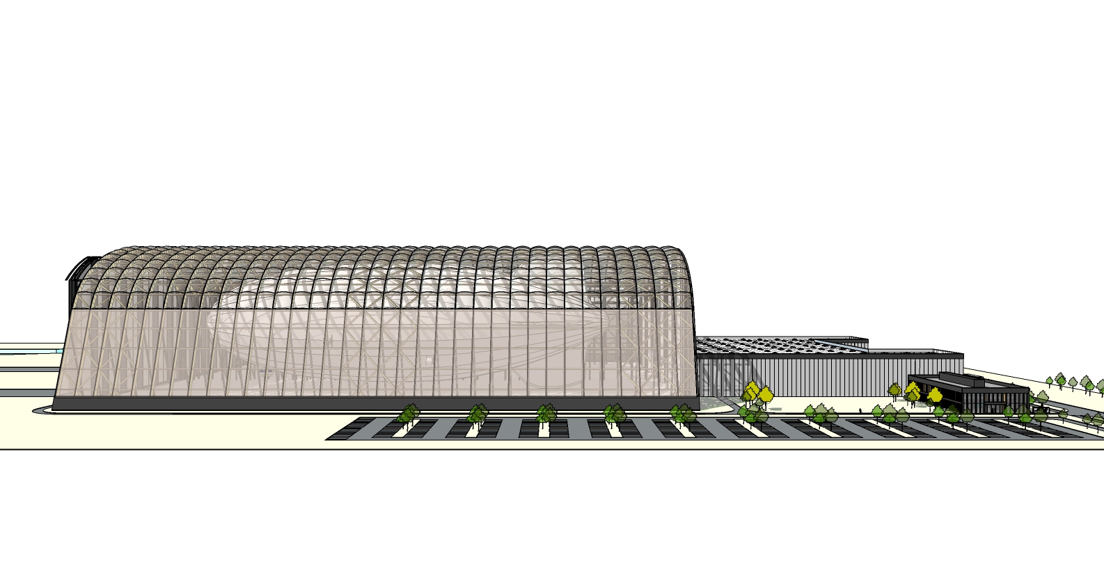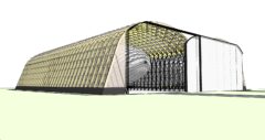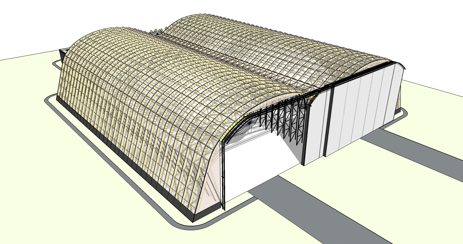 Les FAH (Final Assembly Hall) sont constitués d’immenses arches en bois lamellé collé cintrés sur un entraxe de 6m. Pour améliorer leur comportement sous charges de vent, une contrefiche métallique est disposée coté intérieur, sans empiéter sur le volume utile. Les deux halls étant mitoyens, les arcs reposent au centre sur un poteau réalisé en treillis métallique. Les arcs sont reliés ensemble par une poutre treillis permettant de maintenir les parties hautes et basses des poutres au déversement. L’entraxe de ces anti-devers est variable entre 4,5 et 7m en fonction des zones les plus sollicitées. Le contreventement longitudinal est quant à lui assuré par 3 palées de stabilités également en charpente bois : une à chaque pignon reprenant les efforts sur les façades, et une centrale reprenant les efforts de frottement sur les ondulations des surfaces bombées de la couverture toile. Cette vêture est un clin d’œil aux toiles qui forment l’enveloppe des ballons dirigeables. Le travail sur le bois est un hommage aux forêts du sud Ouest et à la genèse de la société Flying Whales : le transport de bois.