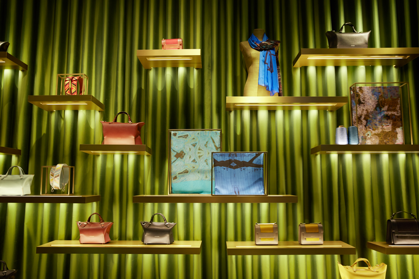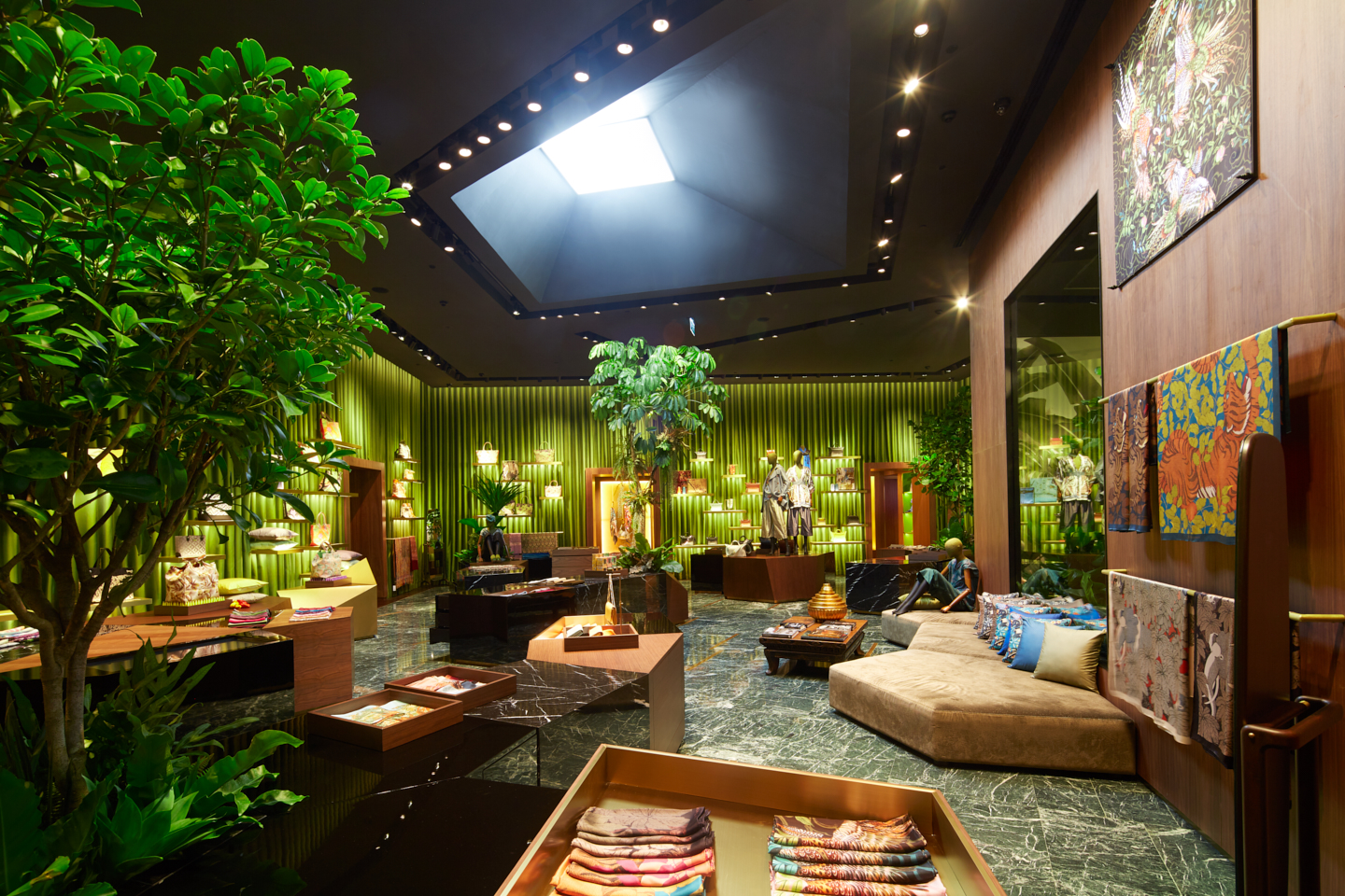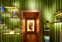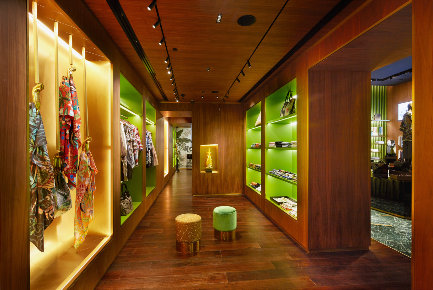 A l’instar de la Maison Jim Thompson à Bangkok, qui formalise, dans la mégapole thaïlandaise, un havre de paix condensant exubérance d’un paysage tropical et intimité feutrée des habitations colorées locales, les boutiques Jim Thompson reproduisent cette juxtaposition d’univers. Une vaste surface centrale symbolise le jardin tropical, clôturée par un fond de scène fait d’un rideau de soie verte et plissée, où s’accrochent et grimpent des étagères supports d’objets. Insérées dans le rideau, des portes épaisses distribuent une série d’alcôves, pièces intimes aux tonalités de bois sombres, de marbre vert, d’éclats dorés, qui regroupent vêtements ou accessoires, dans une mise en scène combinant dialectique orientale et occidentale. A l’interface entre l’espace public et la boutique, les vitrines sont des univers clos, à la scénographie soignée et changeante, reflétant l’univers de la marque. Seule la porte d’entrée vitrée laisse percevoir, comme le portail du jardin, l’espace et les ambiances intérieures.