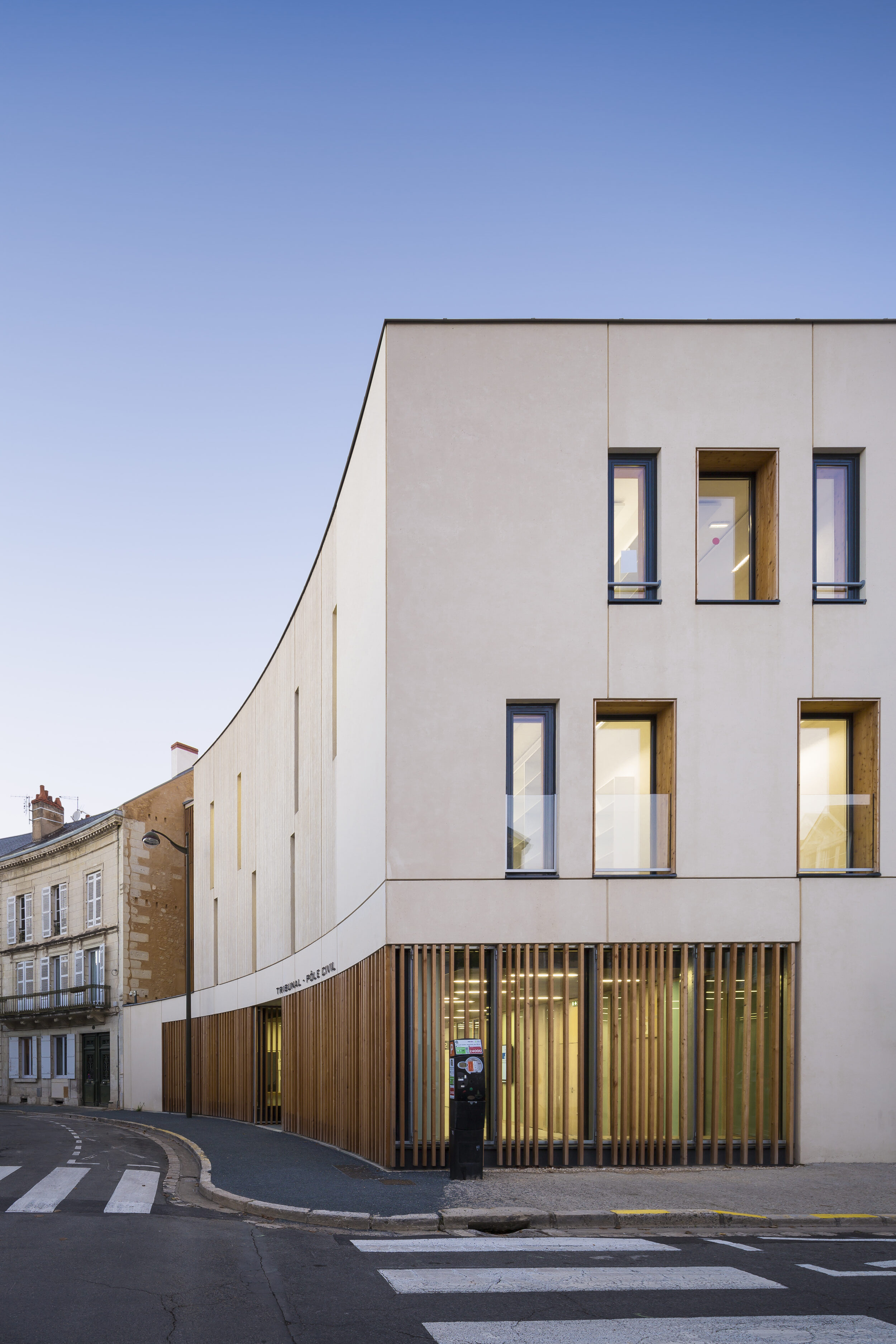 - Le volume d’angle présente, à l’alignement de la place, une façade de béton blanc pratiquement opaque, qui entre en résonance avec l’opacité de la façade du Palais et qui souligne un rez-de-chaussée amplement vitré sur l’espace du hall d’accueil. Le creux vitré formé par le retrait du second corps de bâtiment s’habille, sur ses deux faces, d’une fine résille de tasseaux de bois, filtrant les vues et la lumière naturelle et s’affranchissant du registre formel des baies régulières pour proposer une matière continue définissant l’ensemble du volume. Le bâtiment offre alors à l’ordonnancement classique des édifices de pierre, un alter ego de même gabarit mais à l’écriture contemporaine affirmée. L’organisation des fonctions, avec une façade extérieure dépliée sur la ville et une façade intérieure encadrant un cœur d’îlot ouvert permet de respecter la stricte partition entre espaces publics et niveaux professionnels, qui régit la structure interne de l’édifice.